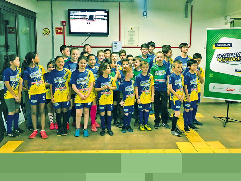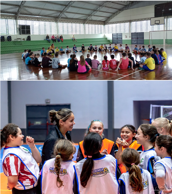 Foto: crianças participam do projeto Academia e Futebol no ginásio do Campus Panambi