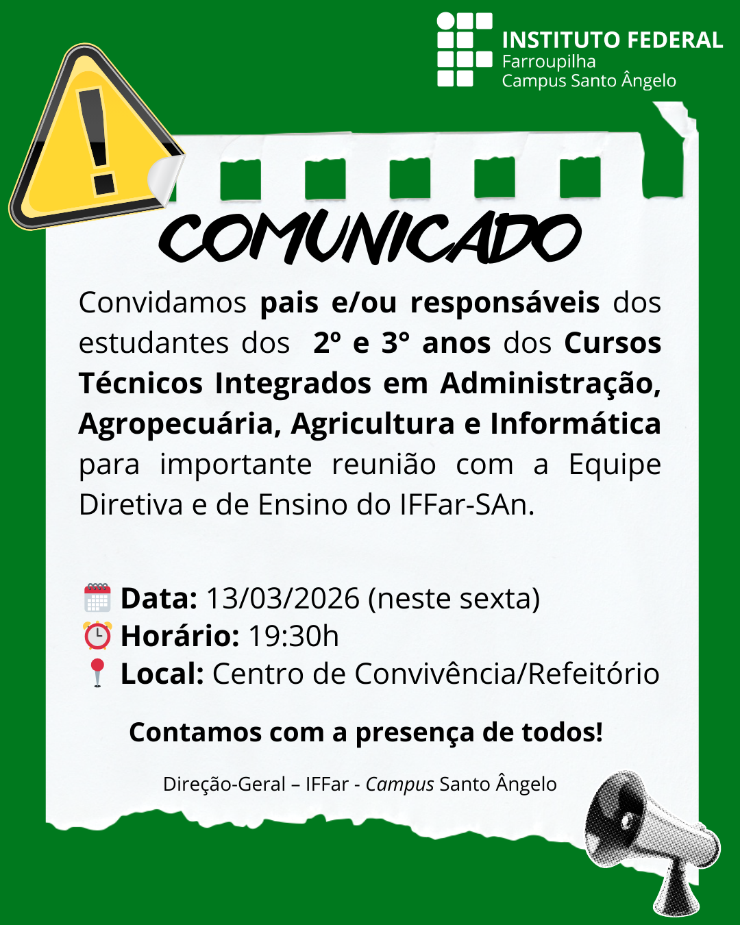 O Instituto Federal Farroupilha – Campus Santo Ângelo convida os pais e/ou responsáveis pelos estudantes dos 2º e 3º anos dos Cursos Técnicos Integrados em Administração, Agropecuária, Agricultura e Informática para participarem de uma reunião com a Equipe Diretiva e a Direção de Ensino da instituição.