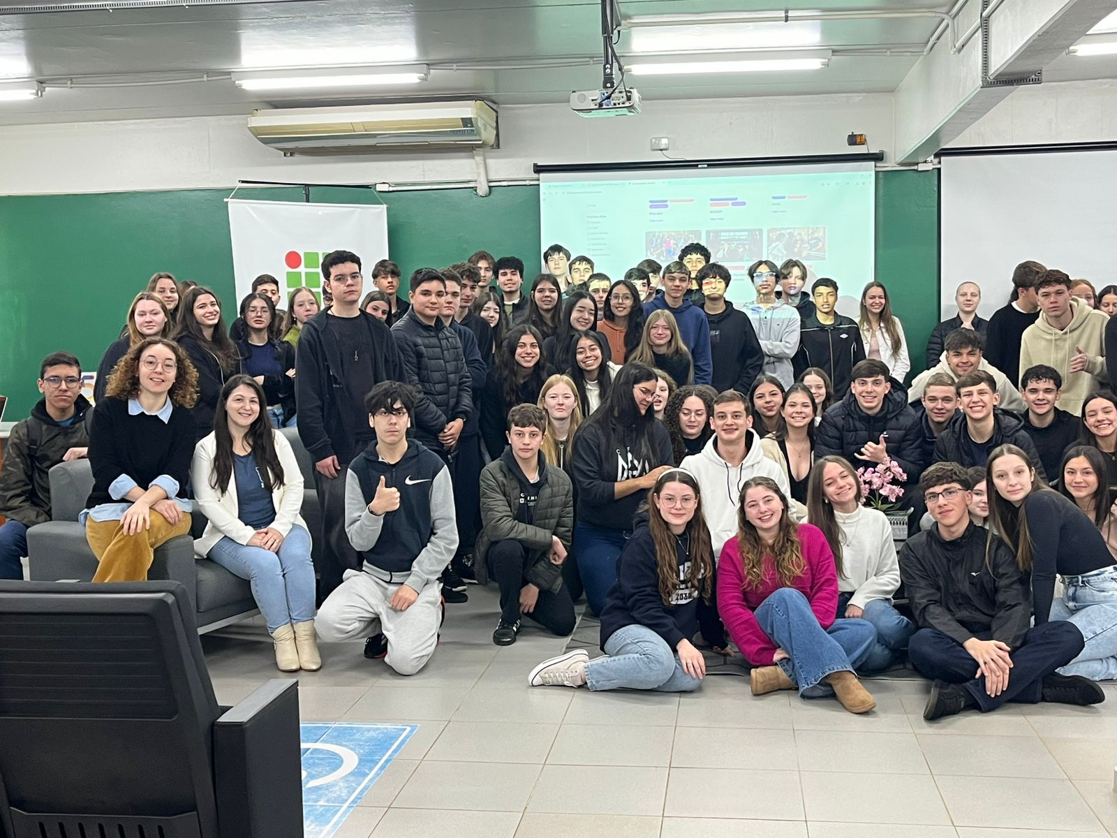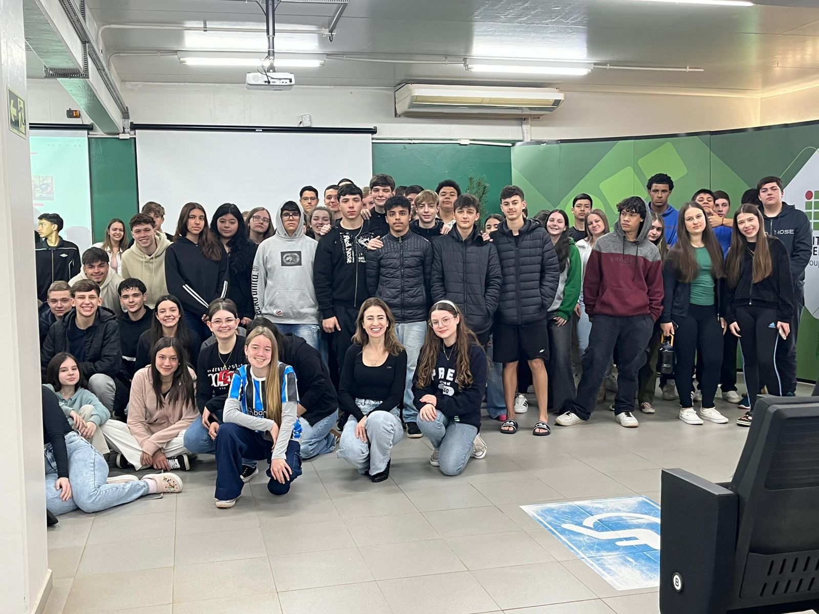A aluna Júlia Meireles Noll, do 3º ano do Curso Técnico em Informática Integrado ao Ensino Médio, apresentou as oportunidades de bolsa de estudos do Prep Program, iniciativa da Fundação Estudar – ONG brasileira que apoia o desenvolvimento de jovens líderes por meio de bolsas de estudo, programas de capacitação e conteúdos voltados à carreira e à liderança. O Prep Program é um curso de um ano de duração que oferece mentoria personalizada e auxílio financeiro a estudantes interessados em realizar estudos no exterior, preparando-os para enfrentar processos seletivos internacionais e potencializando suas chances de sucesso.
