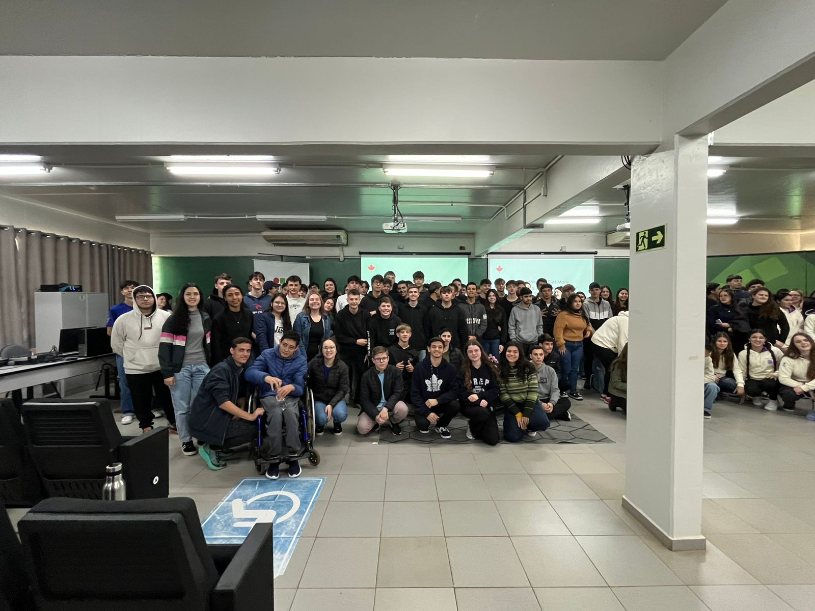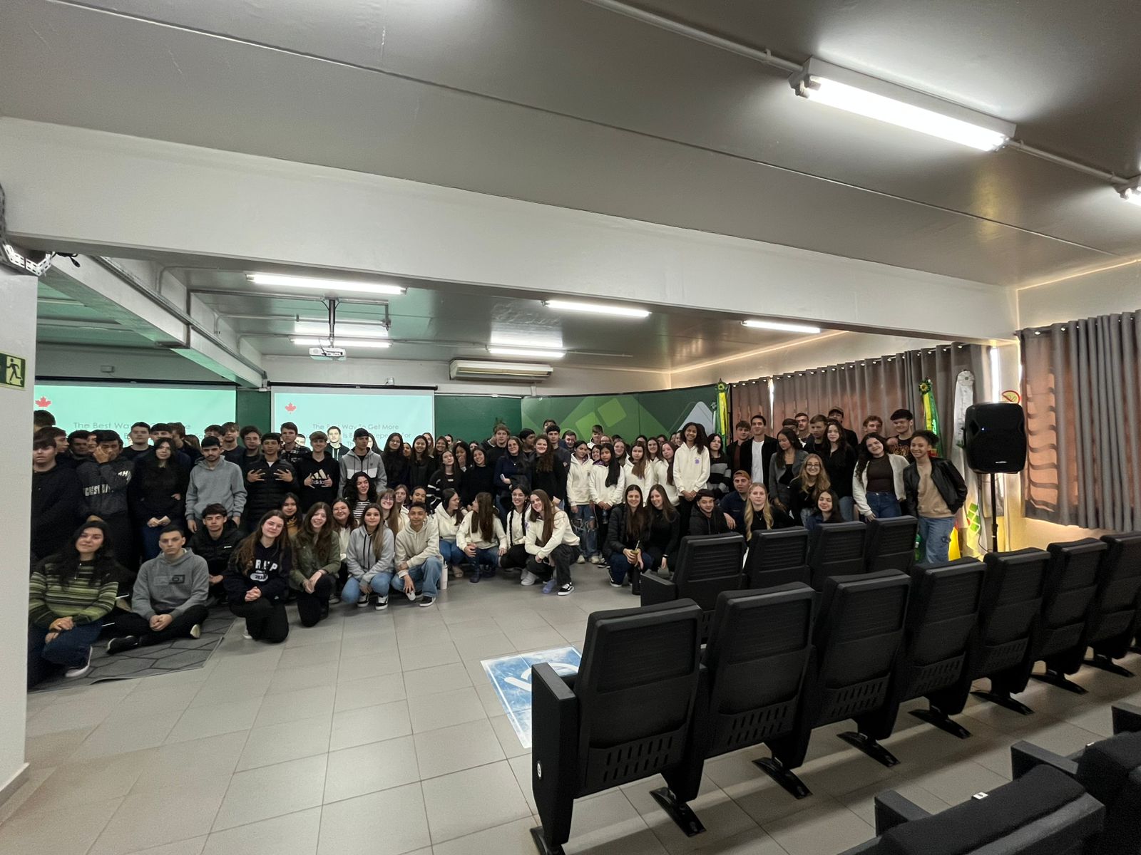 Na sequência, o aluno do 3º ano do curso técnico em informática, Vinicius Henrique Paloschi, compartilhou com os estudantes a sua experiência internacional. Em julho deste ano, Vinicius participou de um programa de intercâmbio no Canadá, onde teve a oportunidade de vivenciar a cultura local, aprimorar seus conhecimentos em língua inglesa e ampliar sua visão sobre o papel da educação em contextos globais. Seu relato despertou o interesse dos estudantes e reforçou a importância de buscar oportunidades que promovam crescimento pessoal, acadêmico e profissional.