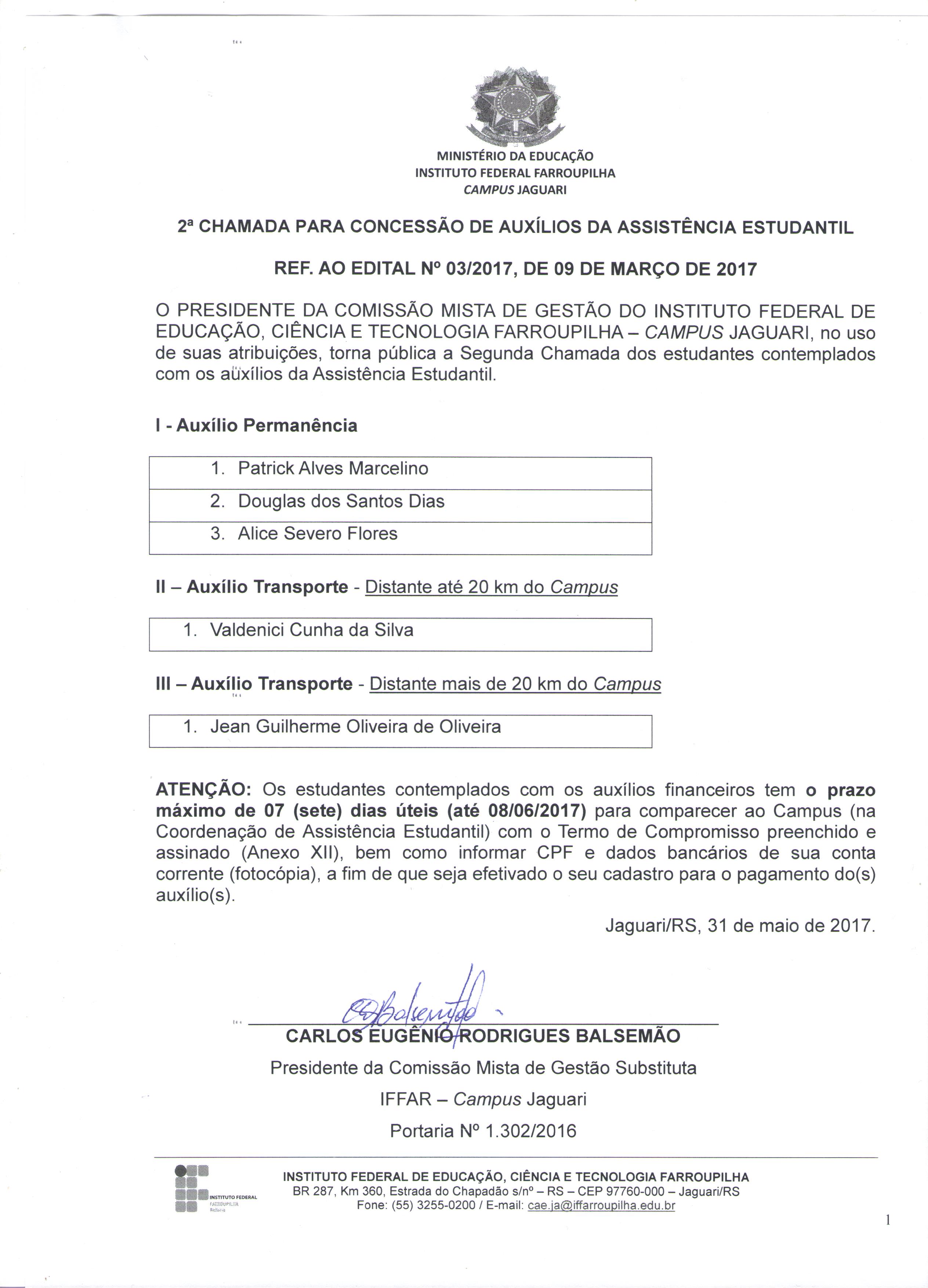 EDITAL Nº 03/2017 - SELEÇÃO DE ESTUDANTES PARA A CONCESSÃO DE AUXÍLIOS DA ASSISTÊNCIA ESTUDANTIL 2017/1.