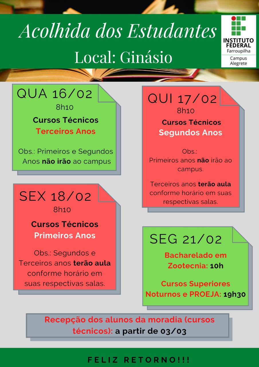Na próxima quarta-feira (16) inicia-se a acolhida dos discentes, sendo que nesta semana está programada a recepção dos alunos dos cursos integrados, e a partir do dia 21 acontecerá a acolhida dos estudantes dos cursos superiores e PROEJA. Confira a programação em anexo.