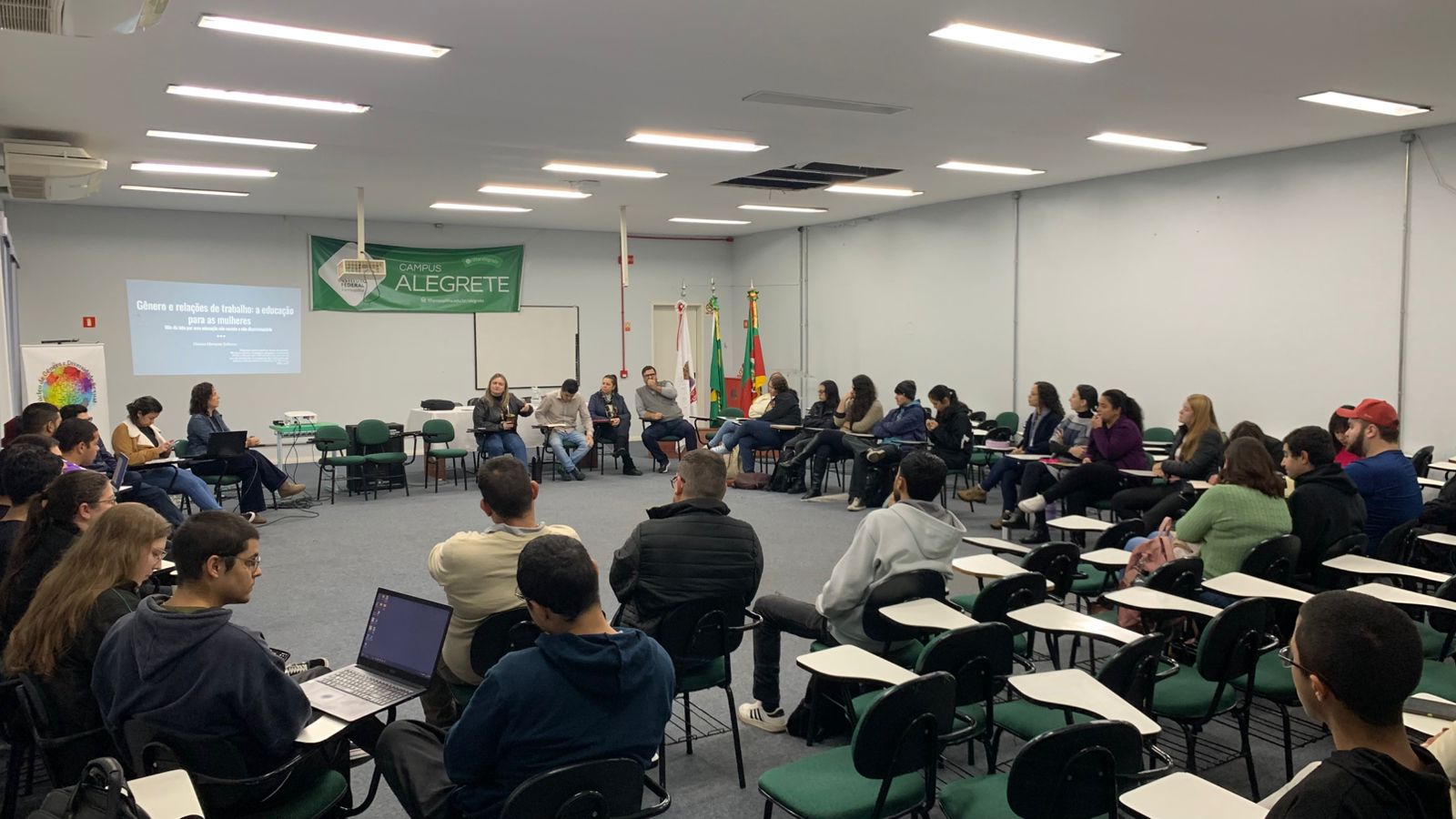 A ação foi voltada aos estudantes dos cursos superiores noturnos do campus e contou com a participação da Técnica em Assuntos Educacionais Daiana Marques Sobrosa, mestre e doutora pela UFSM, que ministrou a fala intitulada “Gênero e Relações de Trabalho: A Educação para as Mulheres”. A convidada apresentou um recorte de sua pesquisa, destacando como legislações educacionais historicamente restringiram os saberes direcionados às mulheres, por meio de currículos reduzidos e limitadores, e como esses processos contribuíram para a exclusão de mulheres de diversas áreas do conhecimento e de trabalho.