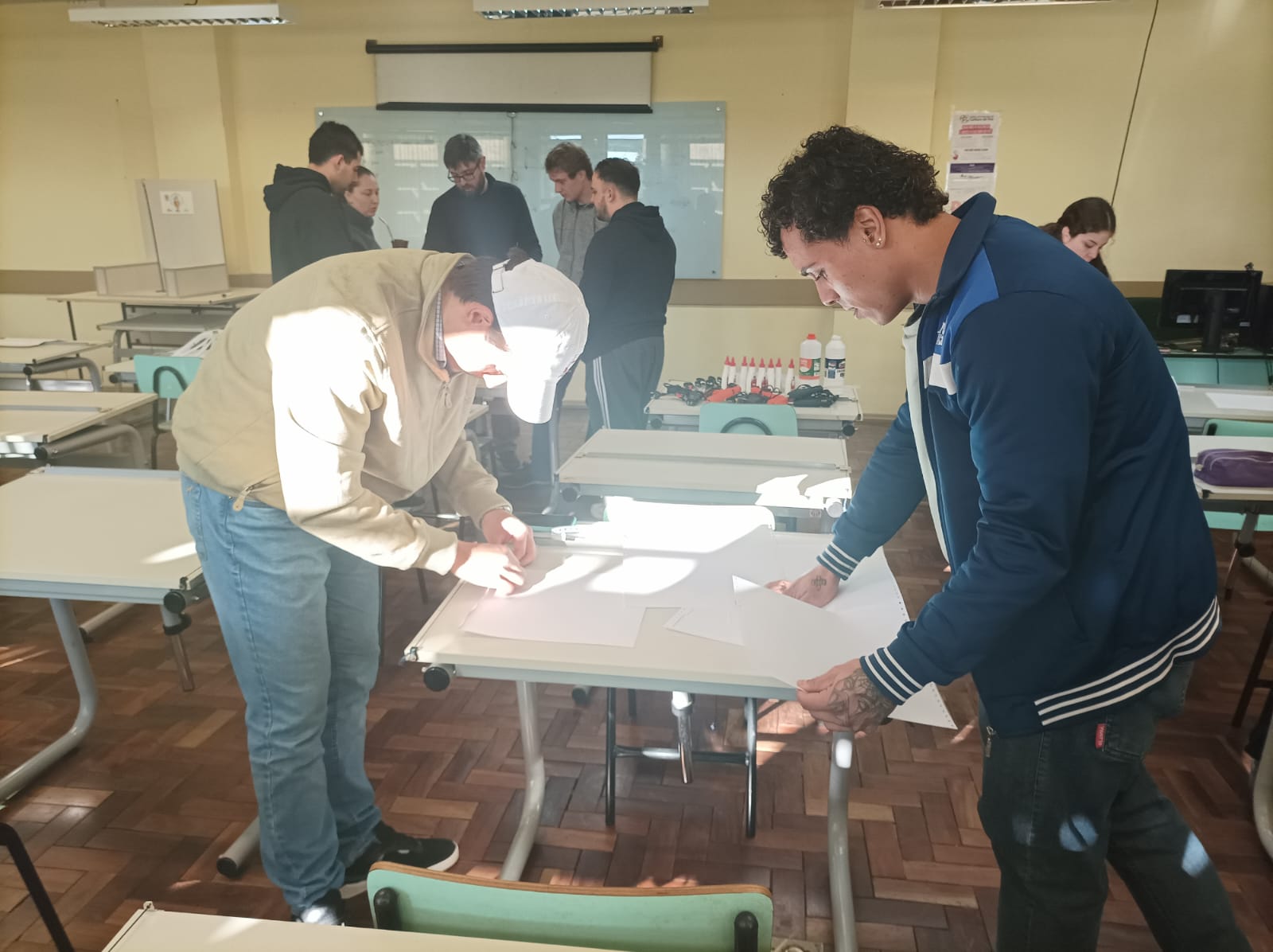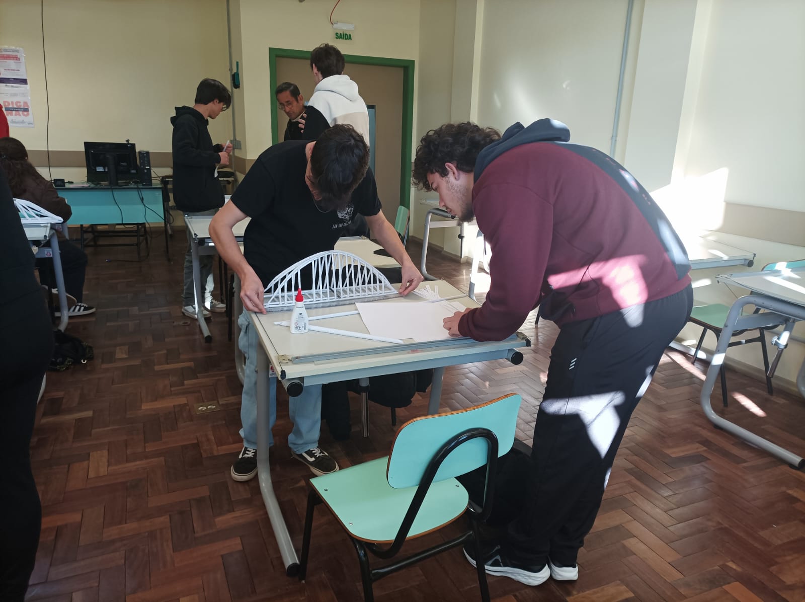 Após uma apresentação inicial sobre as regras e os materiais utilizados, os participantes, organizados em duplas, foram desafiados a construir pontes utilizando apenas papel. A proposta estimulou a criatividade, o raciocínio lógico e o pensamento estratégico dos estudantes, com o objetivo de construir estruturas leves e resistentes.