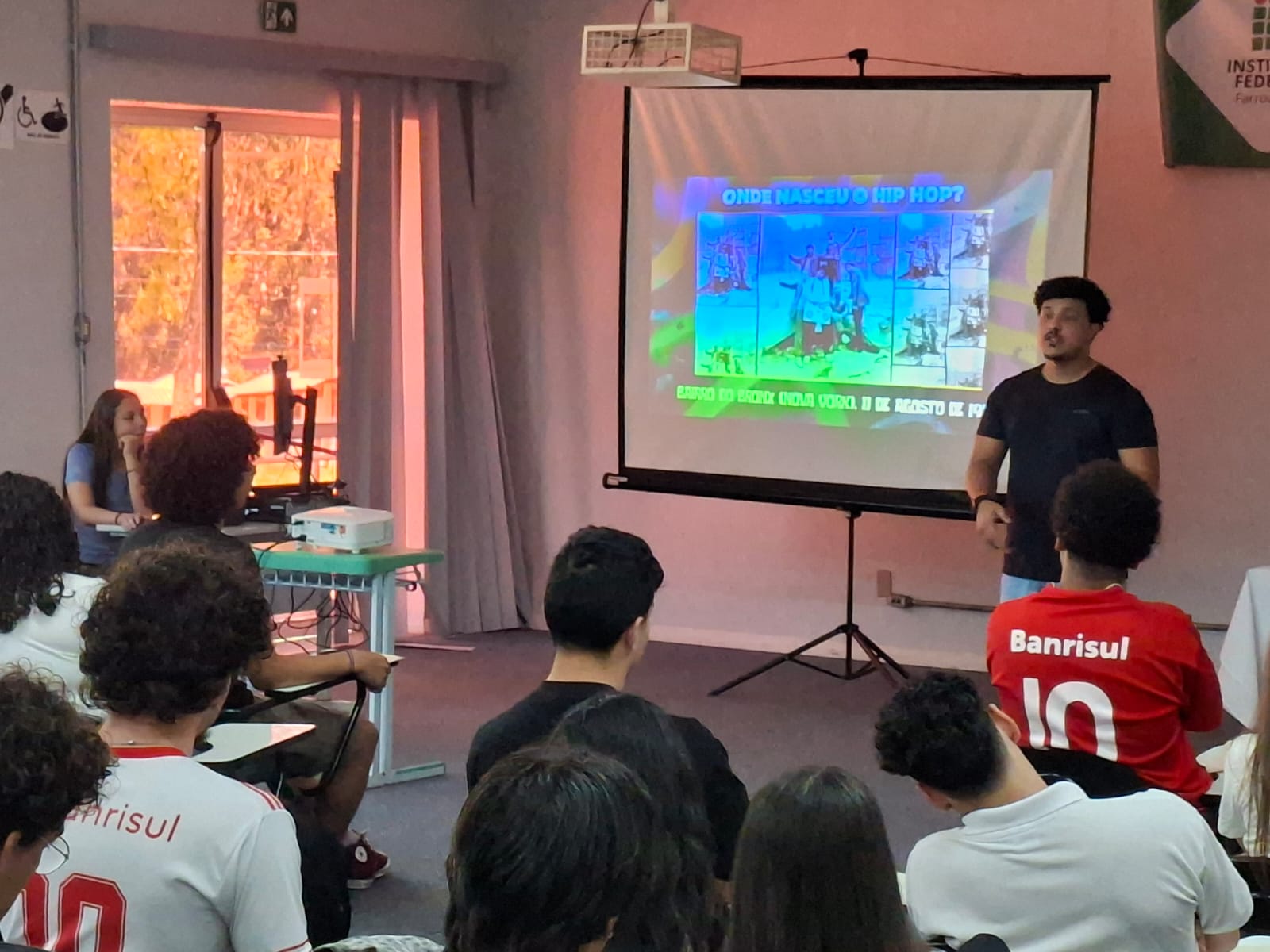 A ação contou com a palestra “Entre rimas e reflexões: o povo negro na arte do Rap”, ministrada por Henry Kesman, aluno do curso Técnico em Informática e integrante do NEABI.
