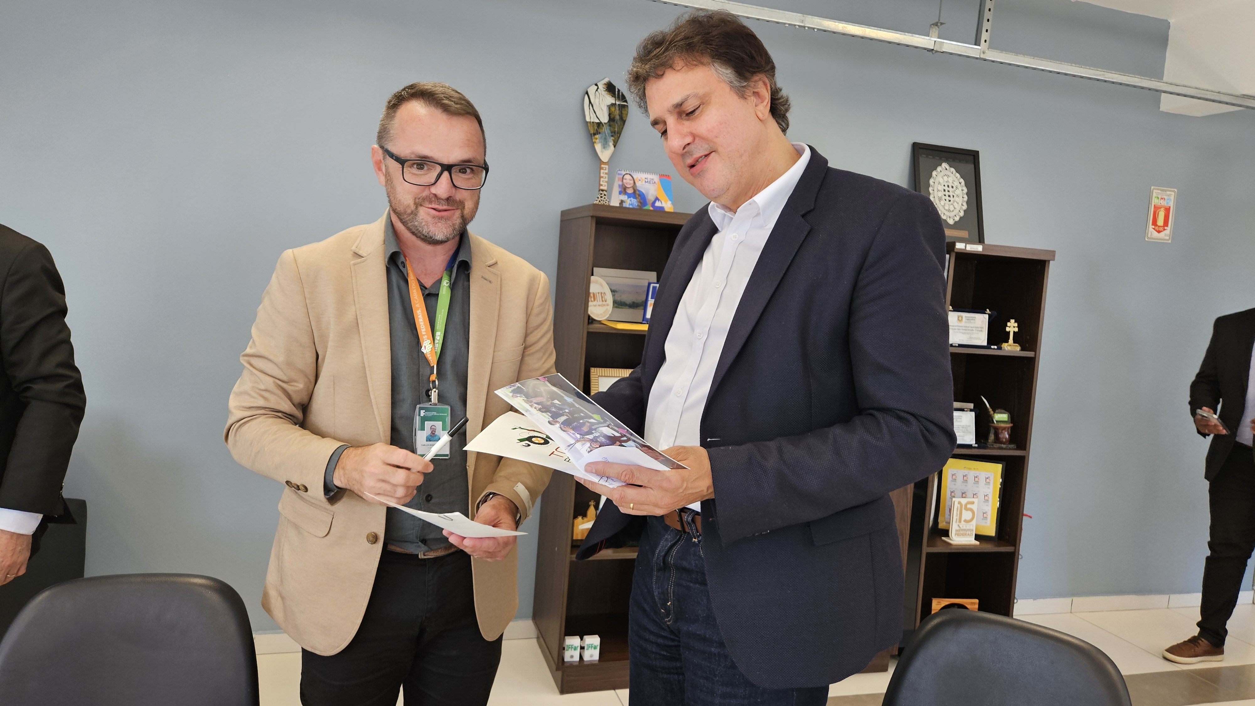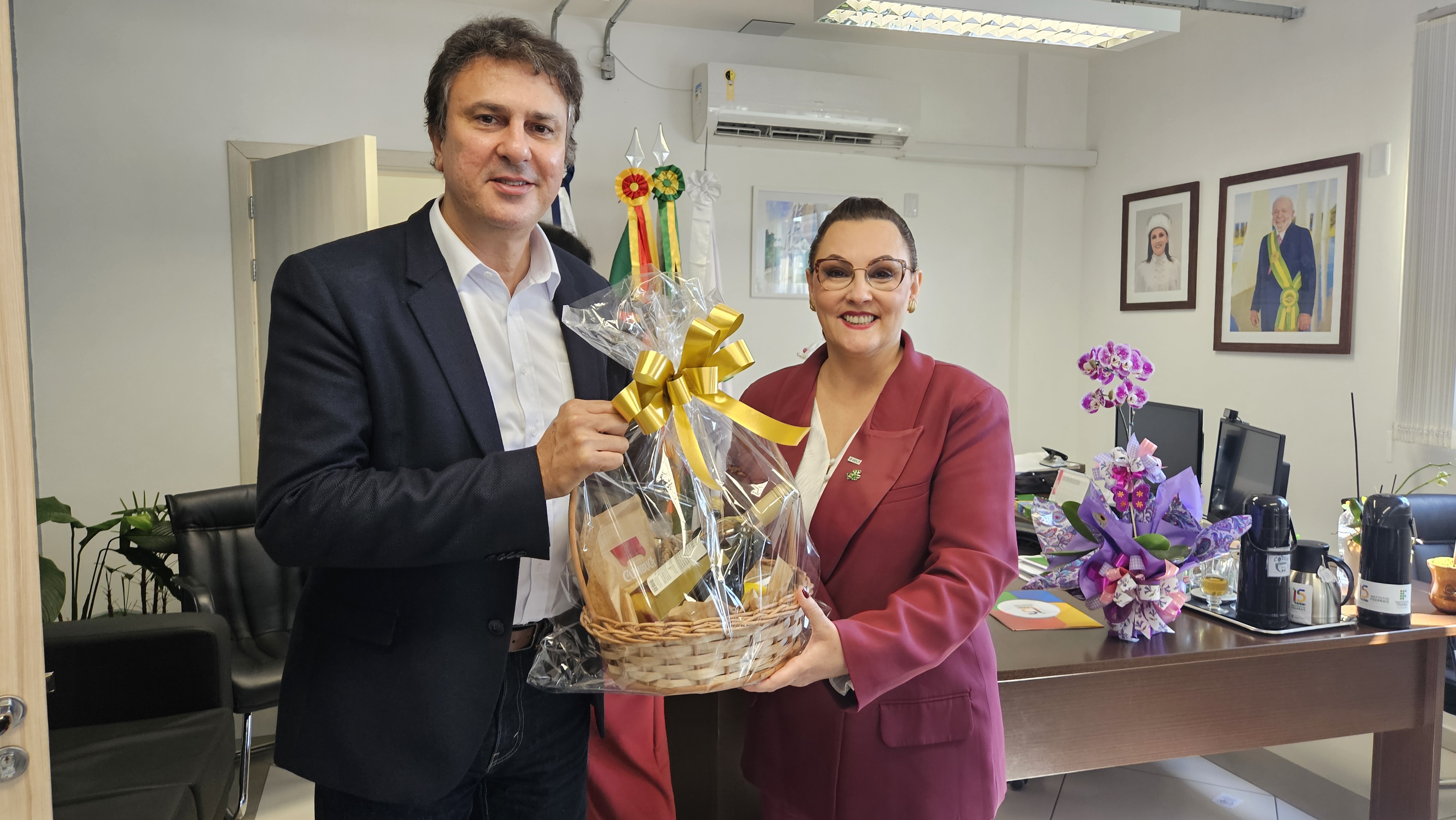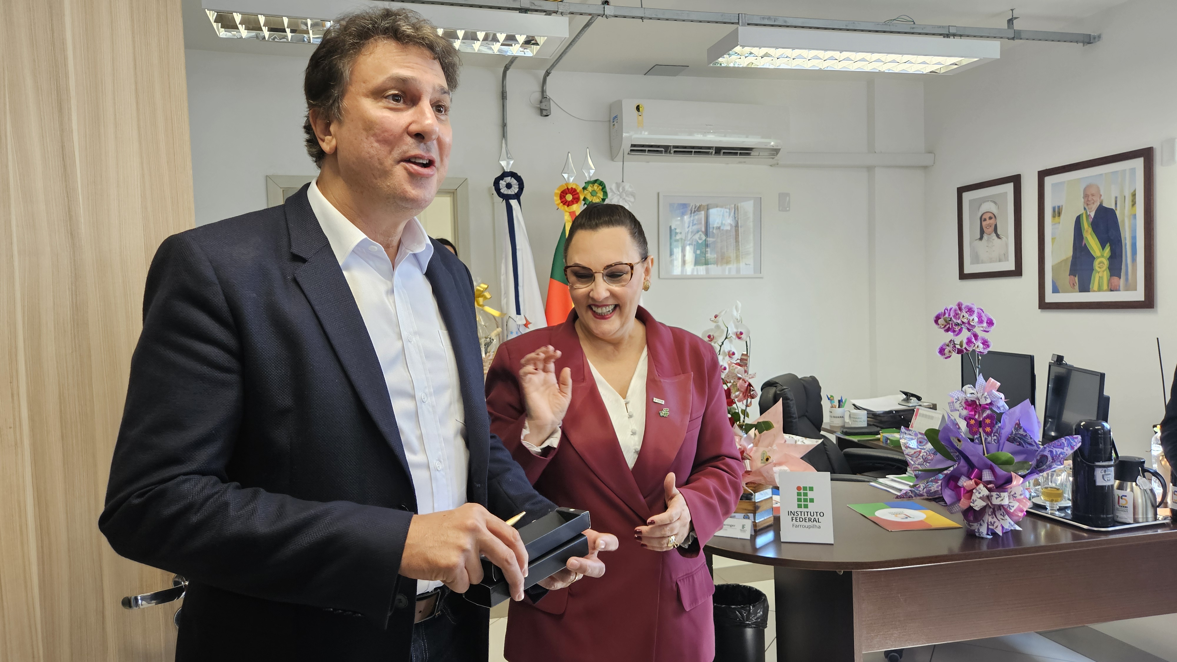 Nesta quinta-feira (21), a reitora do IFFar, professora Nídia Heringer, recebeu em seu gabinete o ministro da Educação, Camilo Santana. O ministro esteve em Santa Maria para a cerimônia que marcou a recondução da reitora ao cargo para a gestão 2025-2029. O evento, realizado no Salão Nobre do Avenida Tênis Clube, reuniu autoridades, servidores e cerca de 400 estudantes de todos os campi do IFFar.