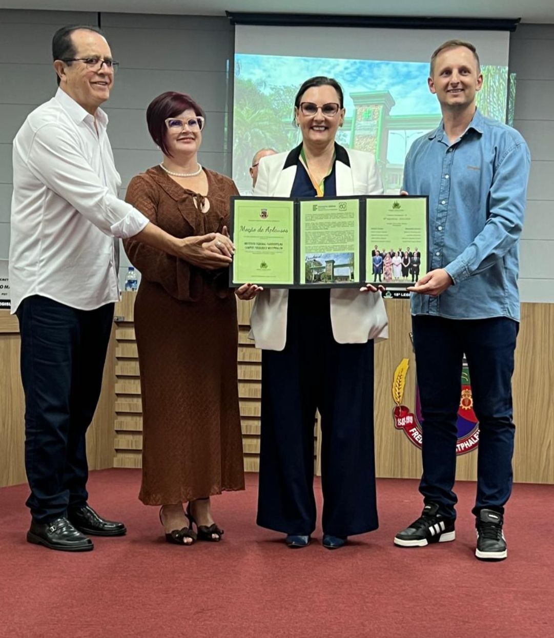 O IFFar – Campus Frederico Westphalen recebeu, na noite desta terça-feira, 24 de março, uma Moção de Aplausos concedida pelo Poder Legislativo do município, em reconhecimento aos 60 anos de atuação da instituição. A homenagem foi realizada durante a Sessão Ordinária da Câmara de Vereadores e contou com a presença da reitora do IFFar, professora Nídia Heringer, da diretora-geral do campus, professora Silvana Alves Pedrozo, além de servidores, estudantes, egressos e representantes da comunidade local.