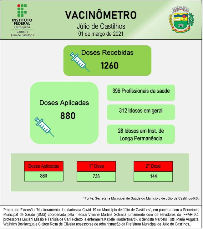 O Instituto Federal Farroupilha Campus Júlio de Castilhos (IFFAR-JC), por meio do Projeto de Extensão “Monitoramento dos dados da Covid-19 no município de Júlio de Castilhos", em parceria com a Secretaria Municipal de Saúde (SMS) apresenta os dados sobre a infecção pelo novo coronavírus no município no 6º Relatório Epidemiológico. Este conta com o "Vacinômetro", que destaca o acompanhamento da vacinação contra a Covid-19 em Júlio de Castilhos.