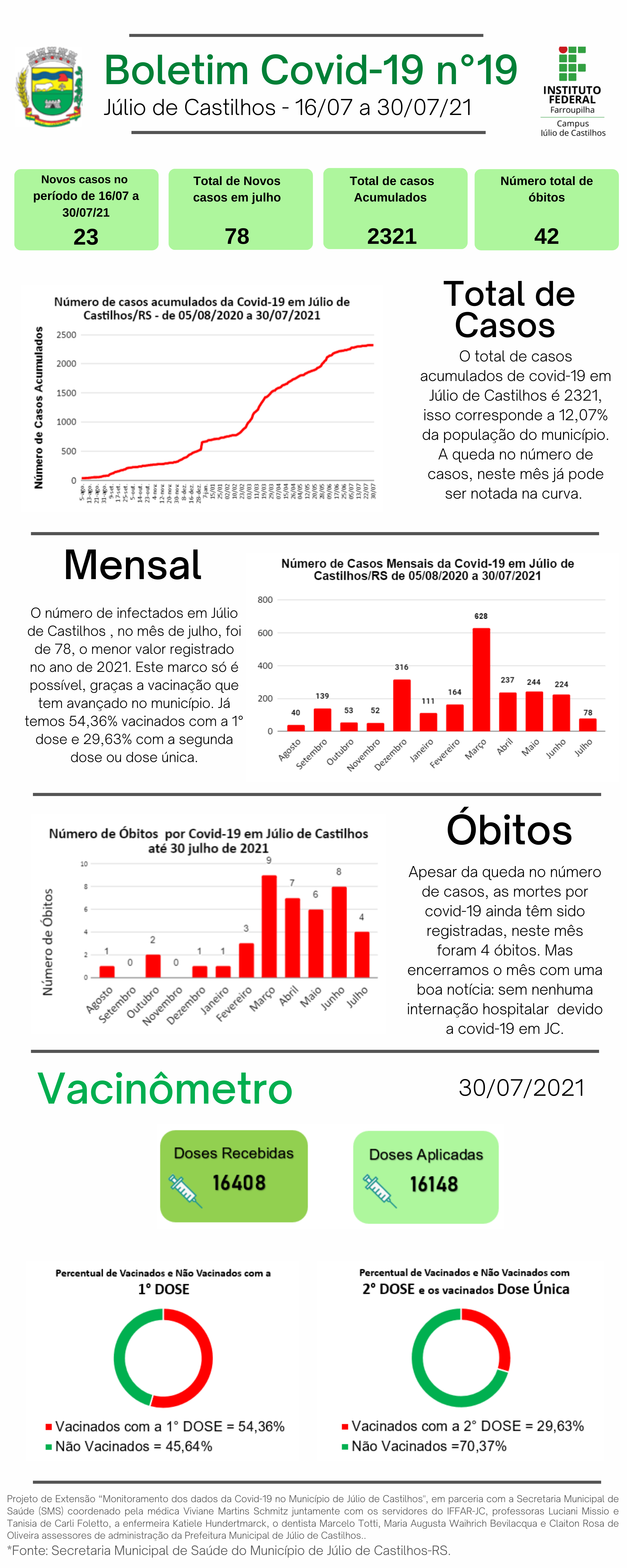 O Instituto Federal Farroupilha Campus Júlio de Castilhos (IFFar-JC), por meio do Projeto de Extensão “Monitoramento dos dados da Covid-19 no município de Júlio de Castilhos", em parceria com a Secretaria Municipal de Saúde (SMS) apresenta os dados sobre a infecção pelo novo coronavírus no município no 19º Relatório Epidemiológico. Este conta com o "Vacinômetro", que destaca o acompanhamento da vacinação contra a Covid-19 em Júlio de Castilhos.