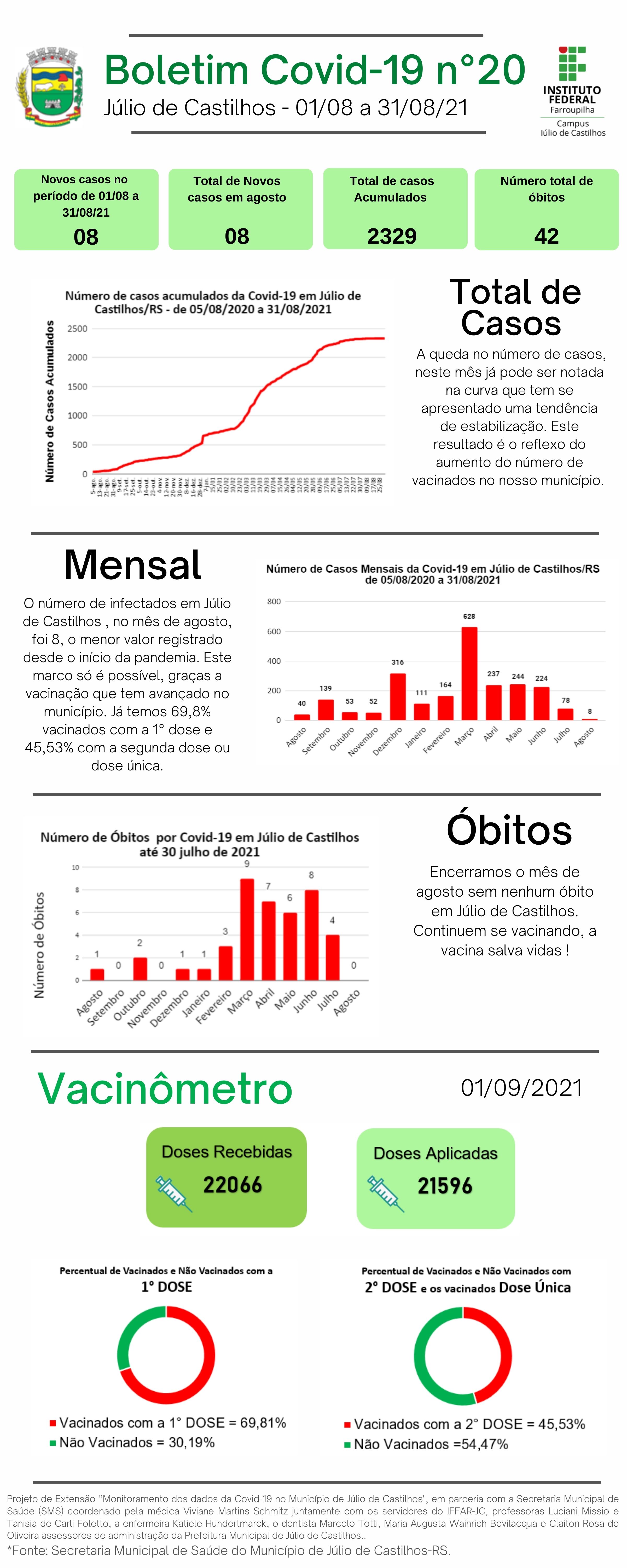 O Instituto Federal Farroupilha Campus Júlio de Castilhos (IFFar-JC), por meio do Projeto de Extensão “Monitoramento dos dados da Covid-19 no município de Júlio de Castilhos", em parceria com a Secretaria Municipal de Saúde (SMS) apresenta os dados sobre a infecção pelo novo coronavírus no município no 20º Relatório Epidemiológico. Este conta com o "Vacinômetro", que destaca o acompanhamento da vacinação contra a Covid-19 em Júlio de Castilhos.