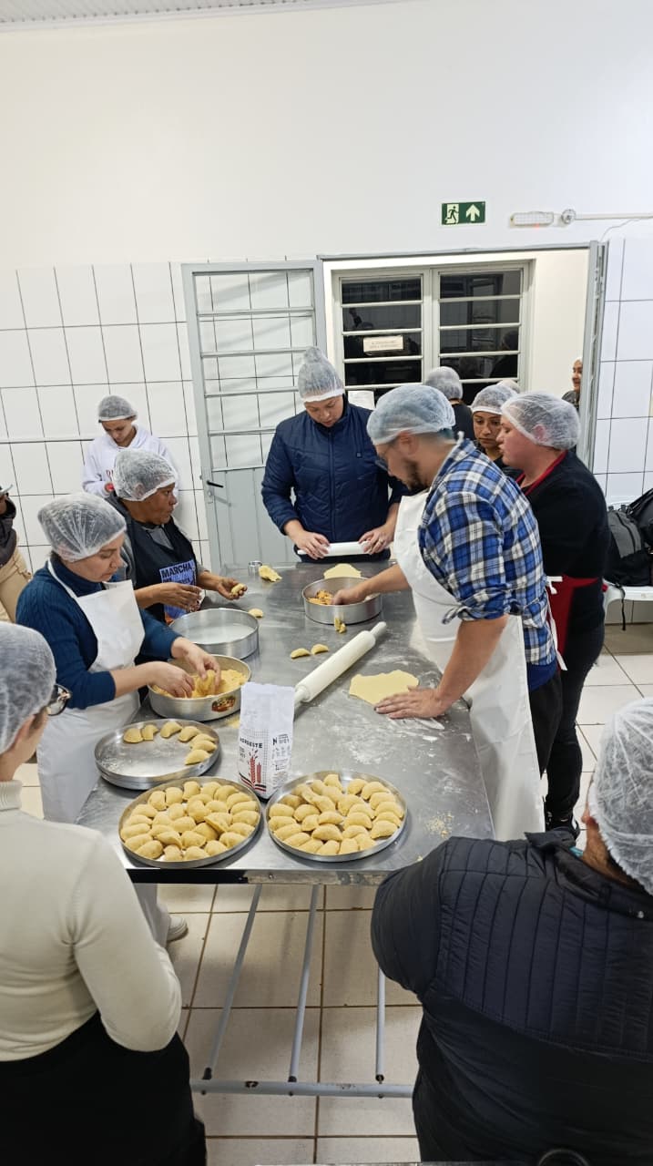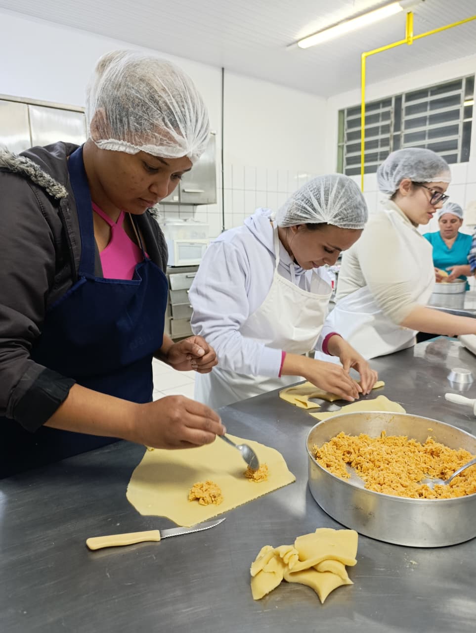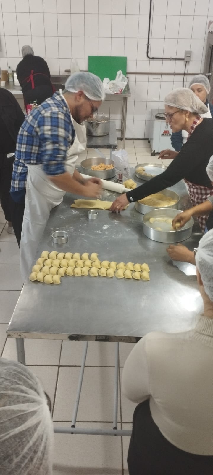 A oficina foi ministrada pela estagiária de Biologia da turma 1A, Jocelaine Gubiani, que ensinou o preparo de risoles. Os/as alunos/as, divididos em grupos, participaram de todas as fases: preparação da massa, montagem, fritura e limpeza do espaço. Ao final, as turmas degustaram os salgados em uma confraternização alusiva ao Dia dos Pais.