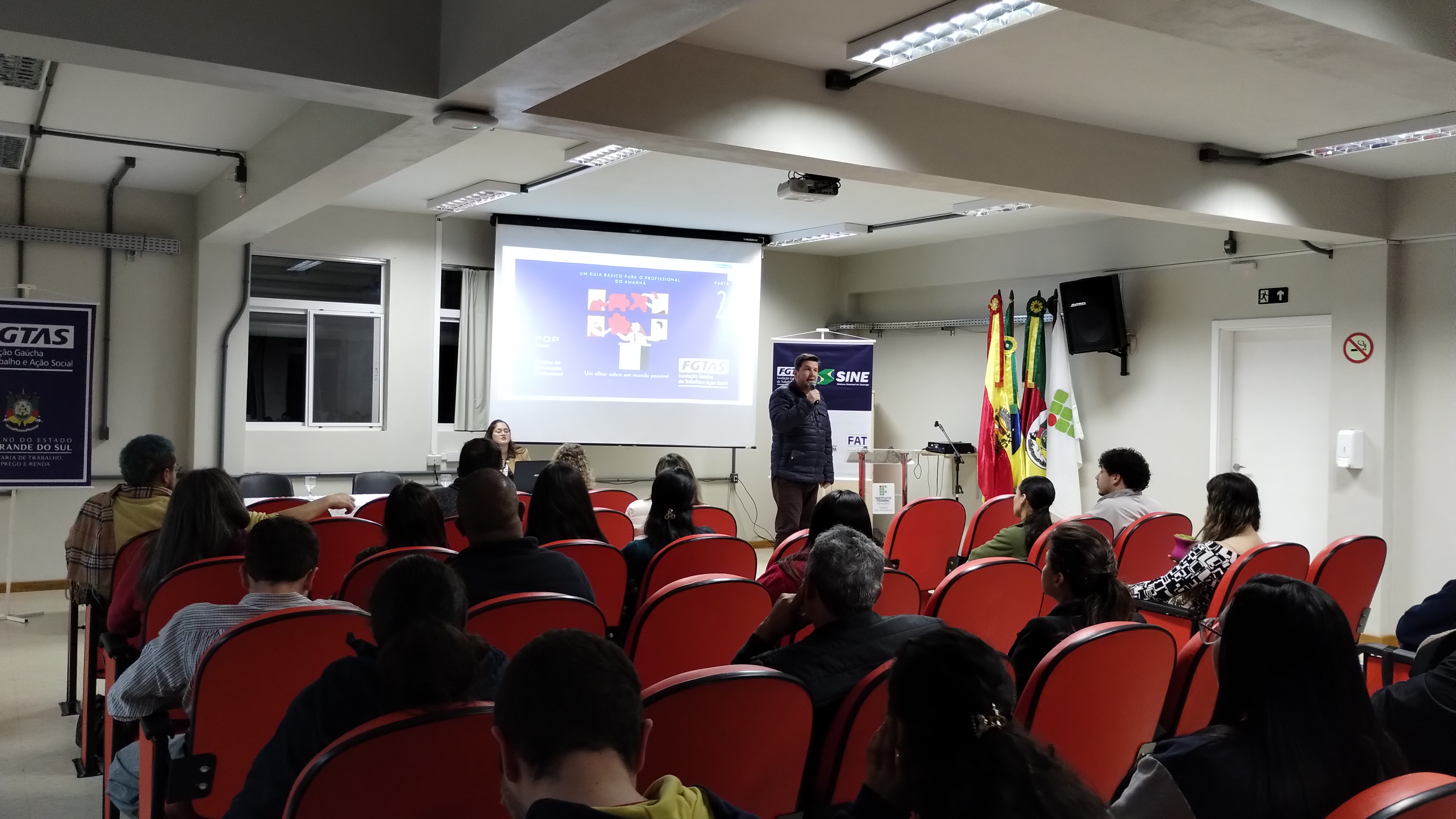 Natalia Dias e Ricardo Monteiro, da agência FGTAS/Sine de Júlio de Castilhos fizeram uma palestra no campus na segunda-feira, 18 de agosto, dividida em dois momentos: pela manhã para as turmas do integrado e à noite para estudantes da gradução, subsequente e EJA/EPT.