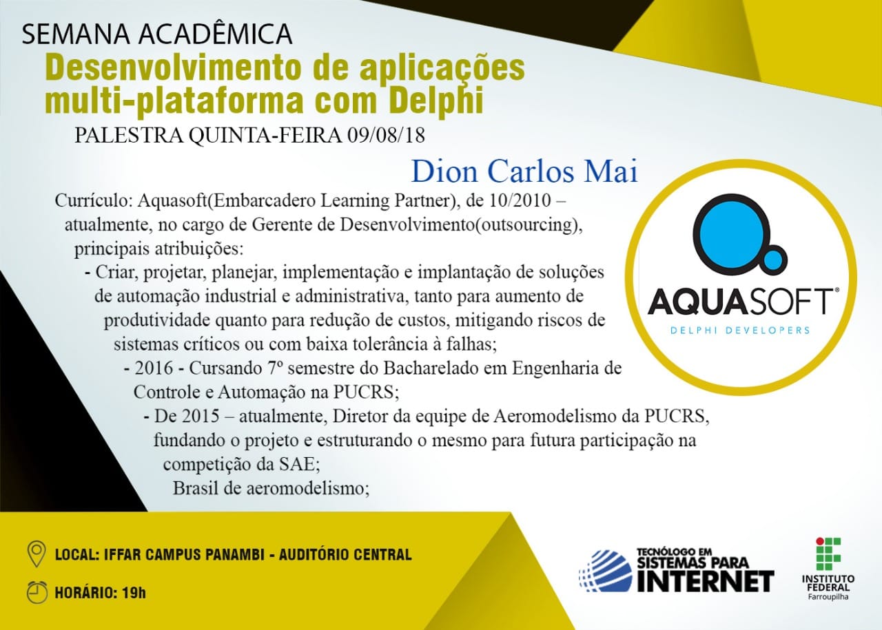 Na terça-feira, 07/08, a instituição receberá a palestra Tech Tour Universitário Brasil, contando com a presença dos palestrantes André Ruschel, Rafael Felipe, ambos MVPs da Microsoft, e também Marcel Goldhart e Claudenir Andrade. Todos possuem larga experiência profissional e falarão sobre as áreas de Open Source, Plataforma Microsoft, Azure, Cloud Foundry, virtualização, Cloud Computing, Internet das Coisas e Inovação Tecnológica. Já na quarta, 08/08, as atividades serão sobre o compartilhamento de relatos de experiência com quatro profissionais da área de Tecnologia da Informação (TI). Na penúltima noite, 09/08, o palestrante Dion Carlos Mai, da AquaSoft, falará sobre “desenvolvimento de aplicações multi-plataforma com Delphi”.