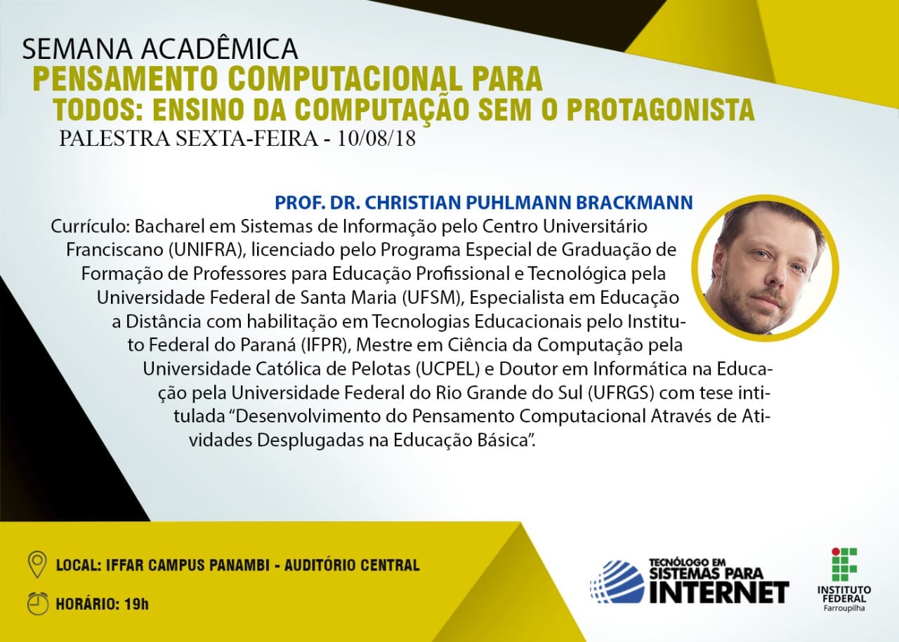 As atividades da Semana Acadêmica encerrarão na sexta, 10/08, com a realização de uma palestra sobre “pensamento computacional para todos: ensino da computação sem o protagonista”, destinado ao desenvolvimento do pensamento computacional para profissionais que atuam na educação básica.