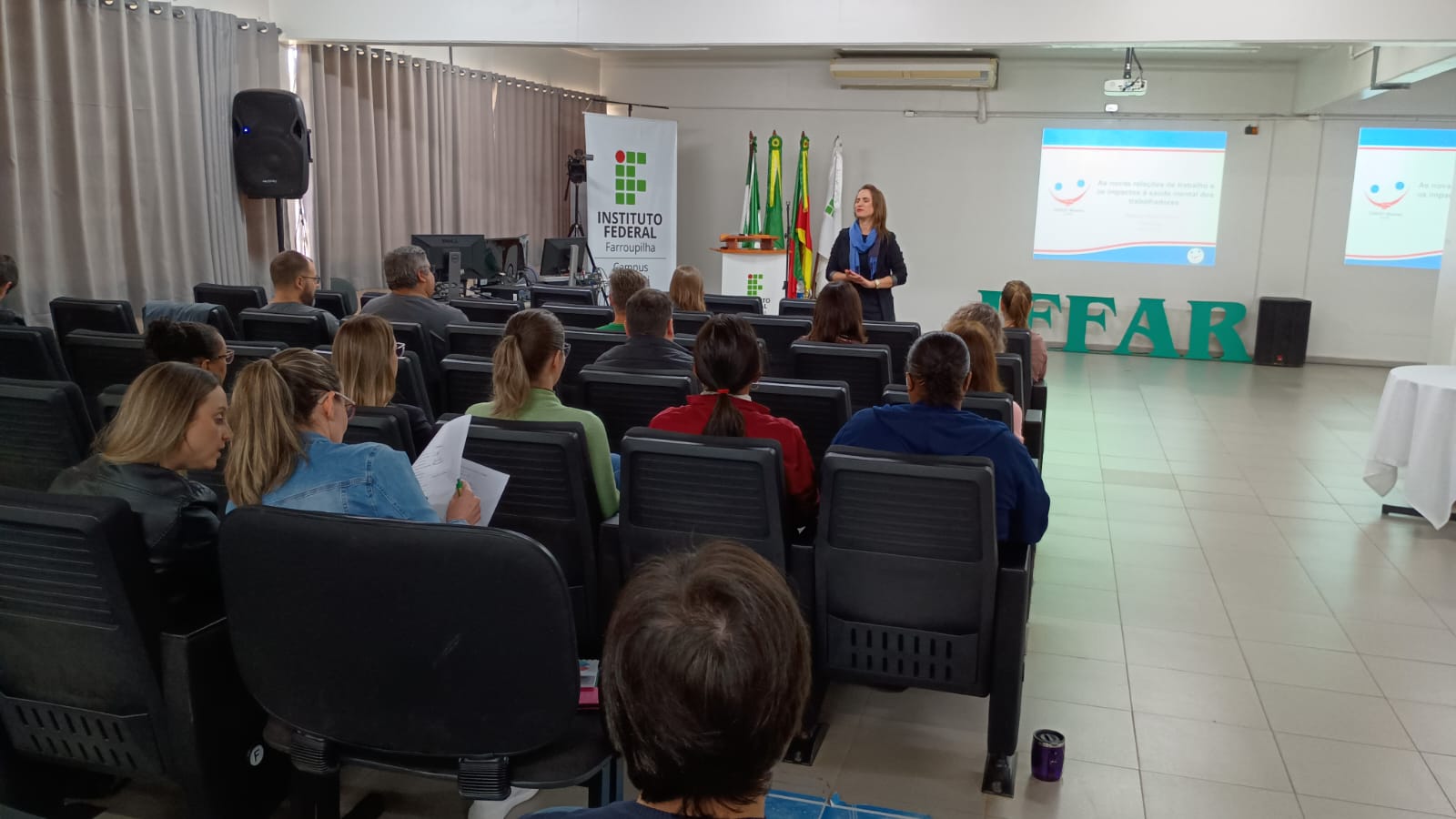 Na tarde desta segunda-feira, 29 de abril de 2025, os servidores Técnicos Administrativos em Educação (TAEs) do IFFar – Campus Panambi participaram de uma atividade de capacitação promovida pela Comissão Interna de Supervisão da Carreira TAE (CIS). O encontro foi realizado no auditório do campus e teve como tema “As novas relações de trabalho e os impactos à saúde mental dos trabalhadores”.