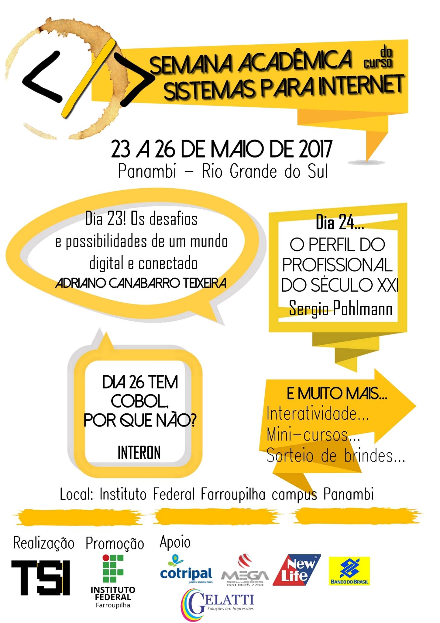 Entre os dias 23 e 26 de maio será realizada a Semana Acadêmica do Curso de Sistemas para Internet do IFFar – Campus Panambi, no turno da noite. A programação trará temas diversos e atuais para qualificar os conhecimentos do público de interesse da área.
