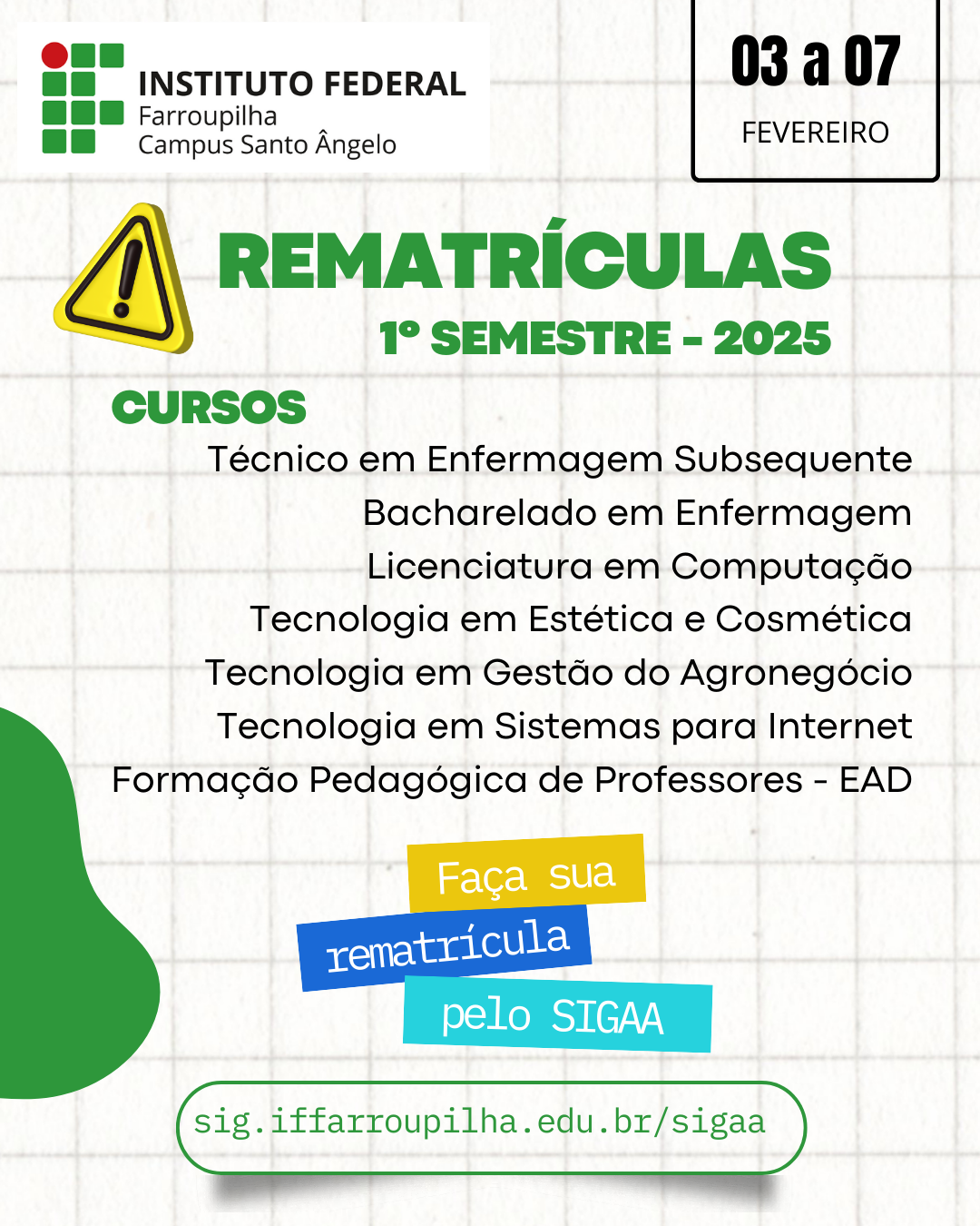 Está aberto o período de rematrícula online do curso Técnico em Enfermagem e dos cursos Superiores do IFFar. O período é de 03 a 07 de fevereiro de 2025.
