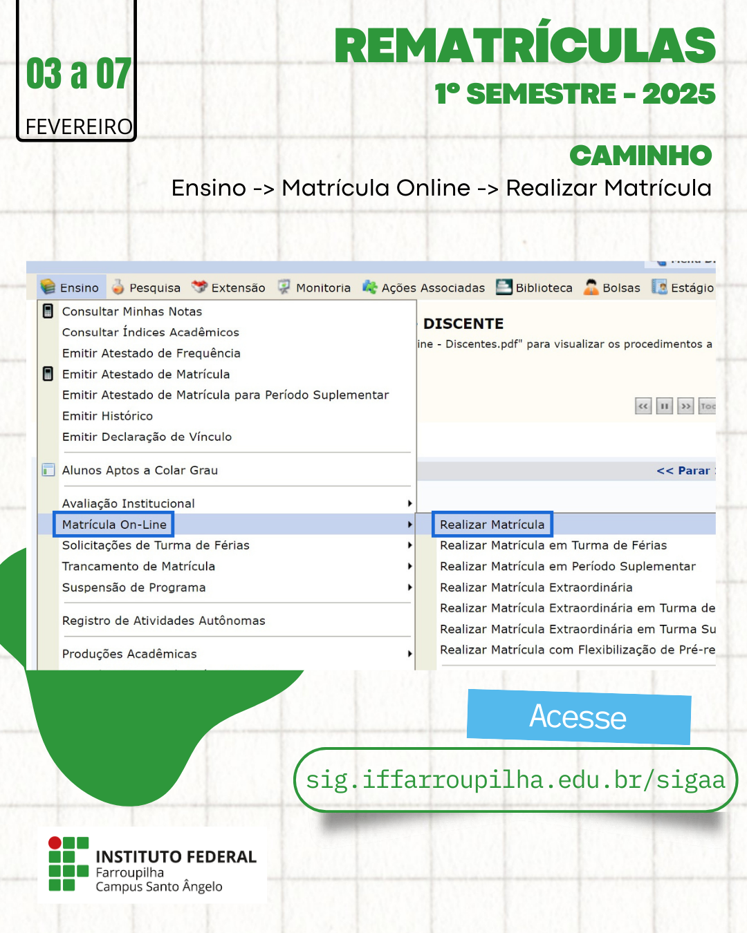 Acesse o SIGAA no Portal do Discente → menu Ensino → Matrícula Online → Realizar matrícula. Link de acesso: https://sig.iffarroupilha.edu.br/sigaa/