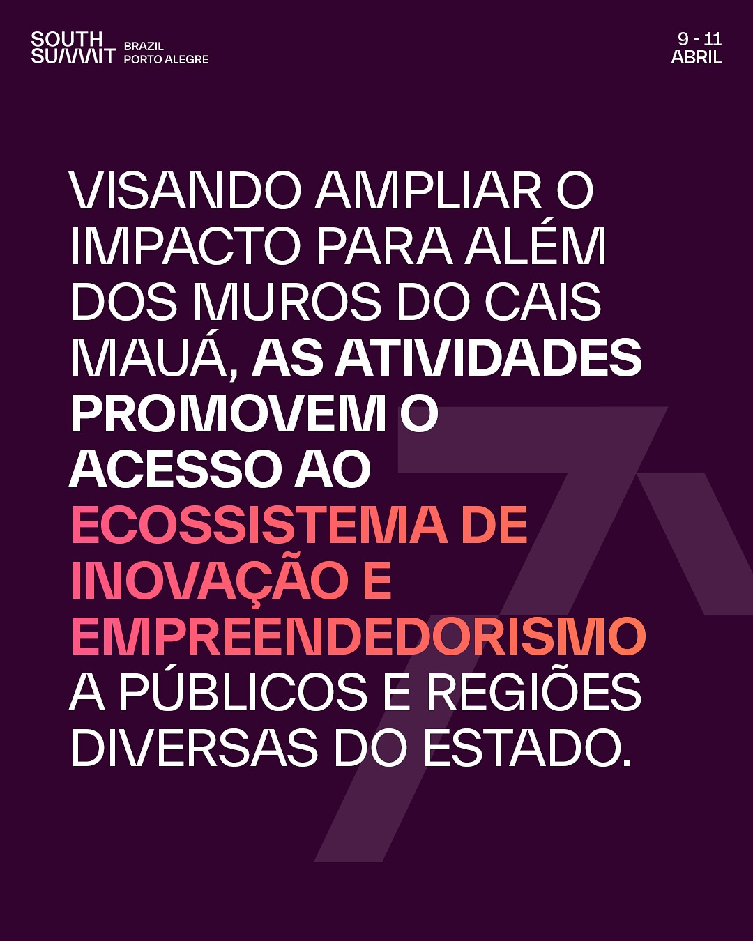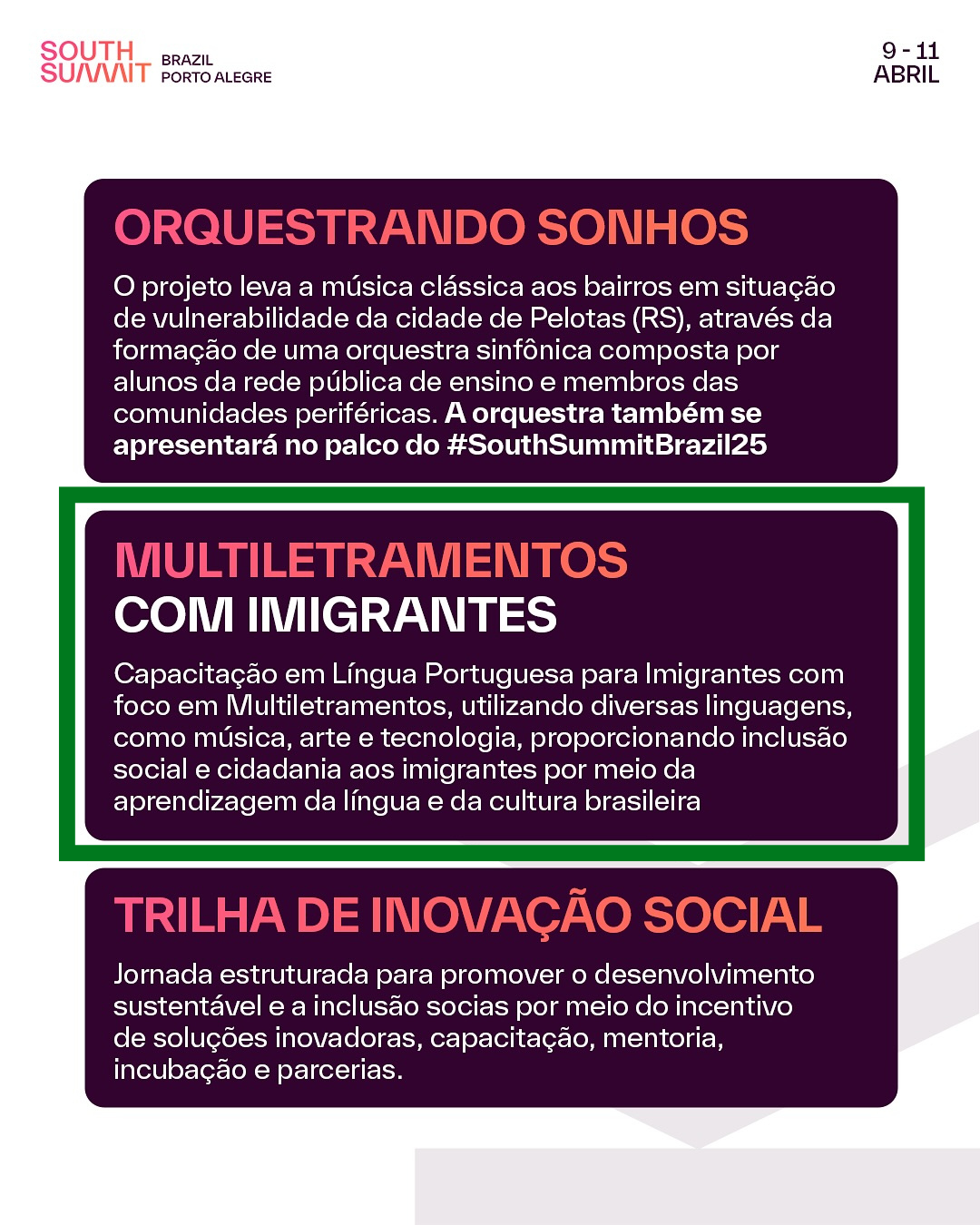 O projeto de Extensão Multiletramentos e interação linguística com Imigrantes será divulgado no South Summit Brazil (SSB) no Palco de Empreendedorismo Social do evento em 11 de abril de 2025. O SSB é um dos maiores encontros do mundo. Este ano, o encontro acontece no Cais Mauá, na capital gaúcha em Porto Alegre/RS, nos dias 9, 10 e 11 de abril, o ponto de conexões e negócios para tecnologia, inovação e empreendedorismo na América Latina.