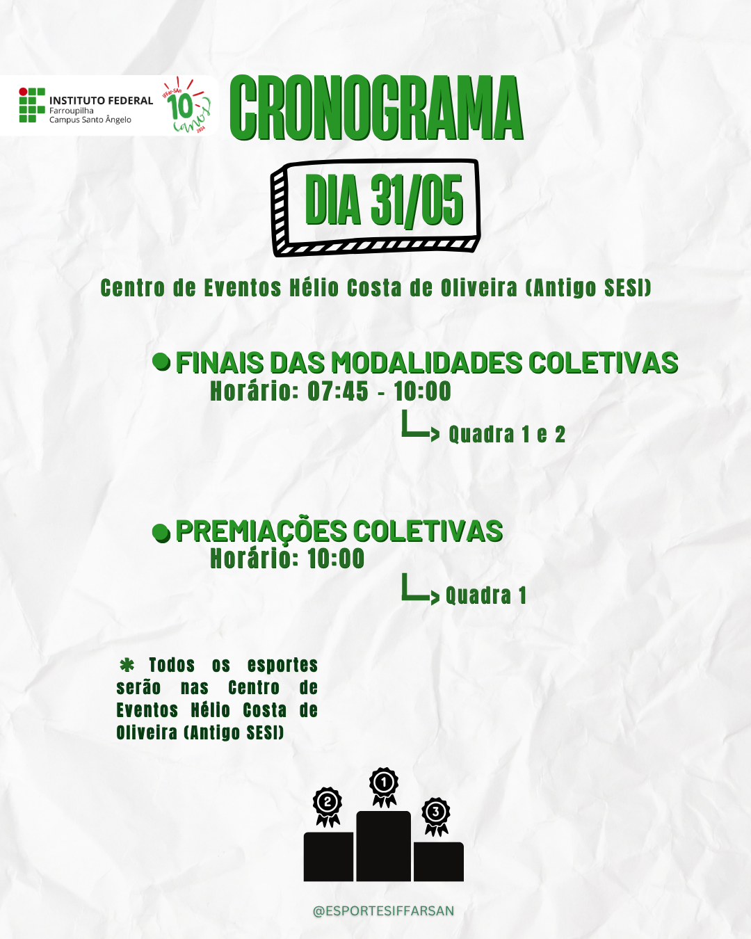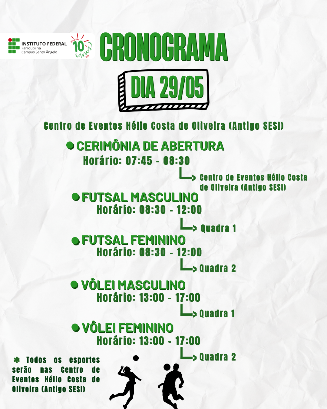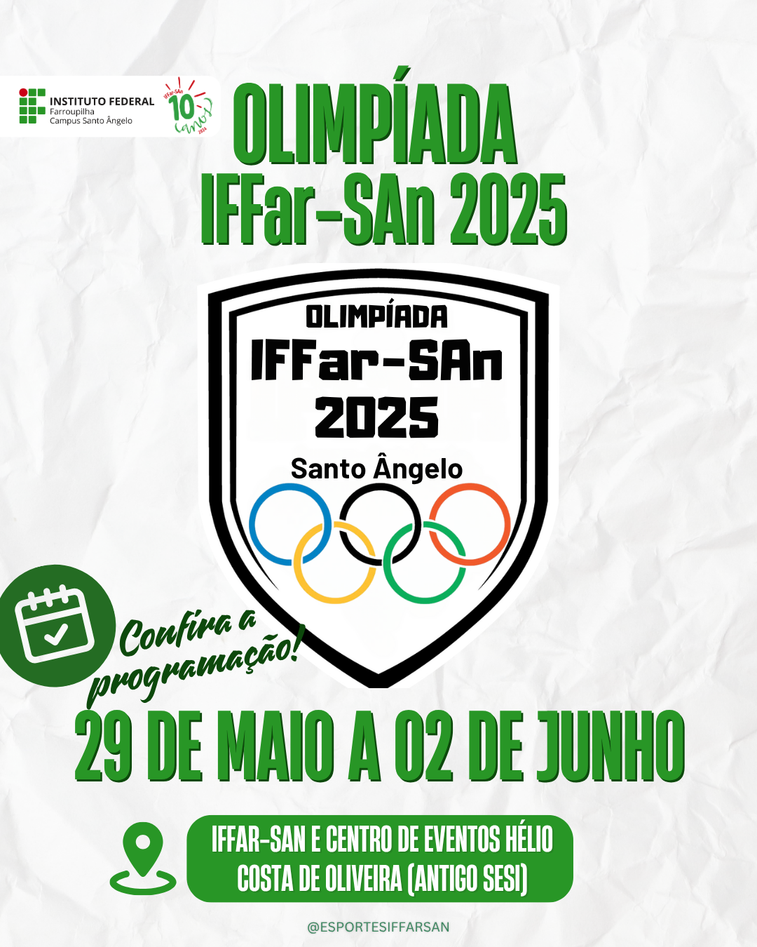 É oficial! Começa hoje (29/05)) a Olimpíada IFFar-SAn 2025! De 29 de maio a 2 de junho, o esporte vai tomar conta do campus e do Centro Municipal de Eventos Hélio Costade Oliveira!