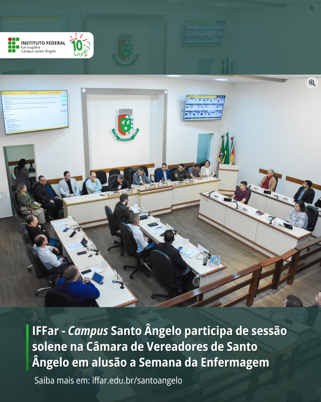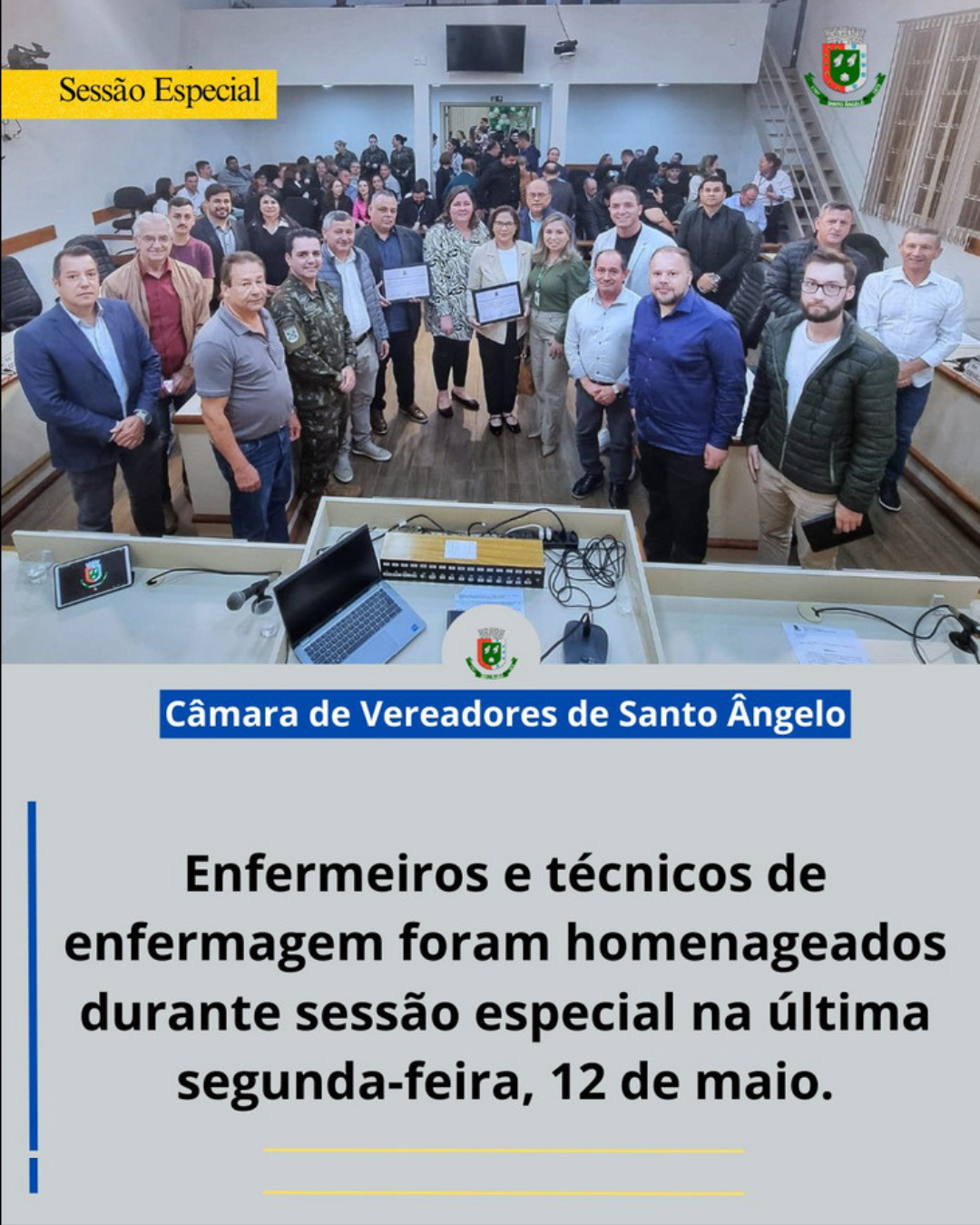 Na noite de 12 de maio, o IFFar Campus Santo Ângelo participou de uma sessão solene promovida pela Câmara de Vereadores de Santo Ângelo em homenagem à Semana da Enfermagem (de 12 de maio - Dia do Enfermeiro(a) à 20 de maio - Dia do Técnico(a) em Auxiliar em Enfermagem). Estiveram presentes vereadores(as), autoridades locais, profissionais da saúde de diversas instituições públicas e privadas, além de representantes de instituições formadoras de profissionais da enfermagem.