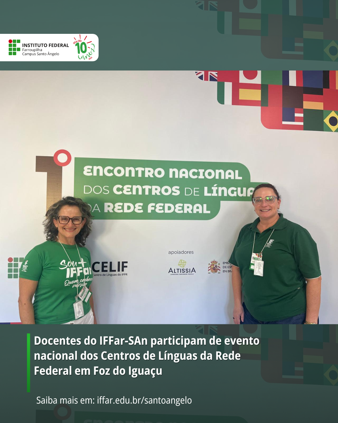 Entre 14 e 16 de maio de 2025, as docentes do IFFar SAN, Maria Aparecida Lucca Paranhos e Letícia Domanski participaram do I Encontro Nacional dos Centros de Línguas da Rede Federal. O evento reuniu representantes de todas as 41 instituições da Rede Federal de Educação Profissional, Científica e Tecnológica (EPCT).  O evento aconteceu no auditório do Itaipu Parquetec e no IFPR - Campus Foz do Iguaçu