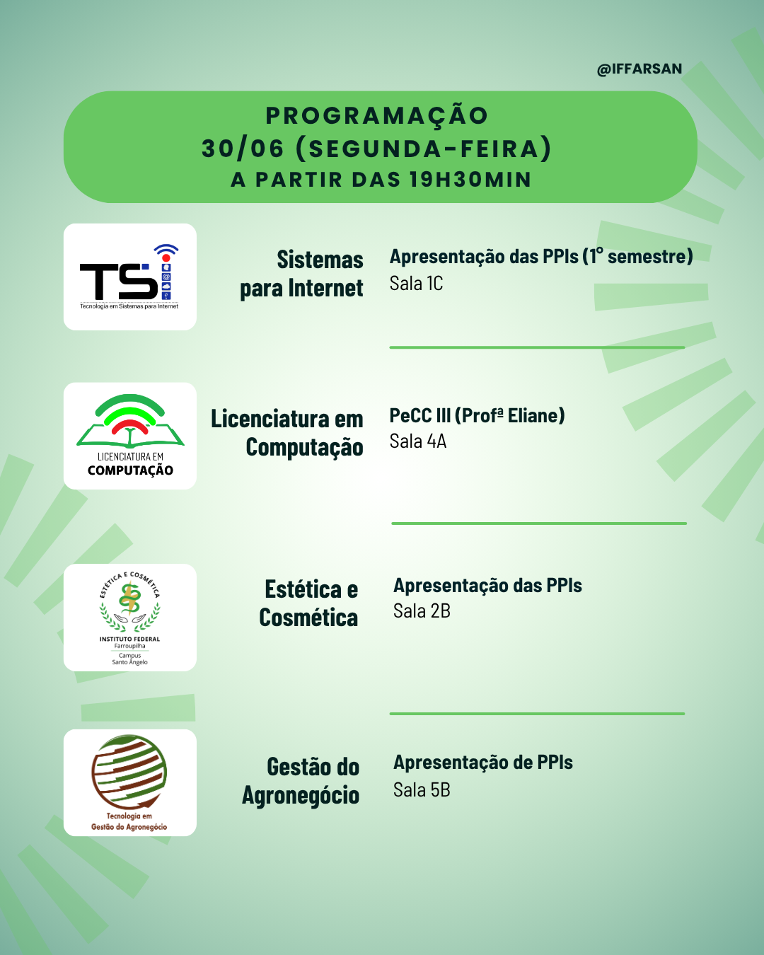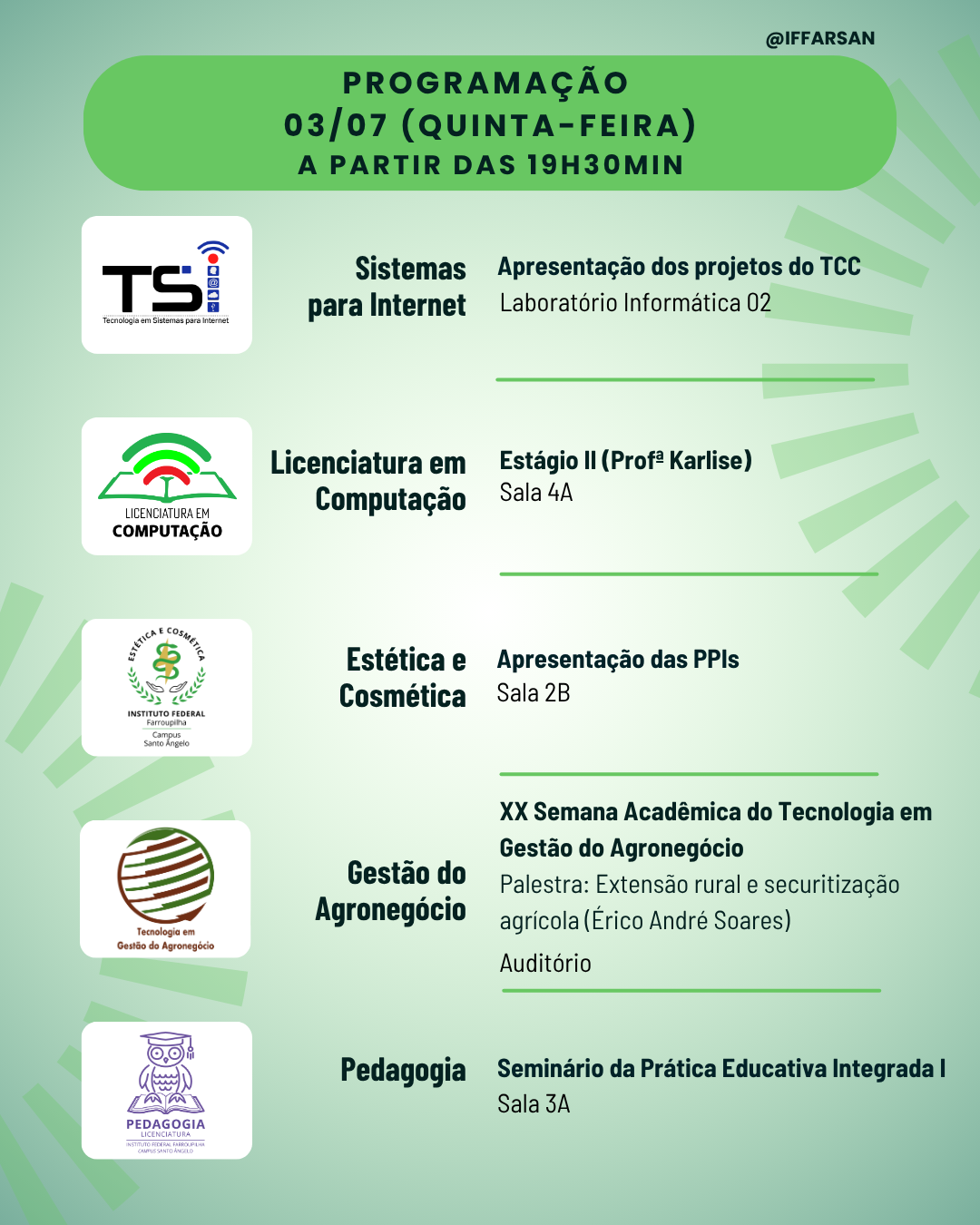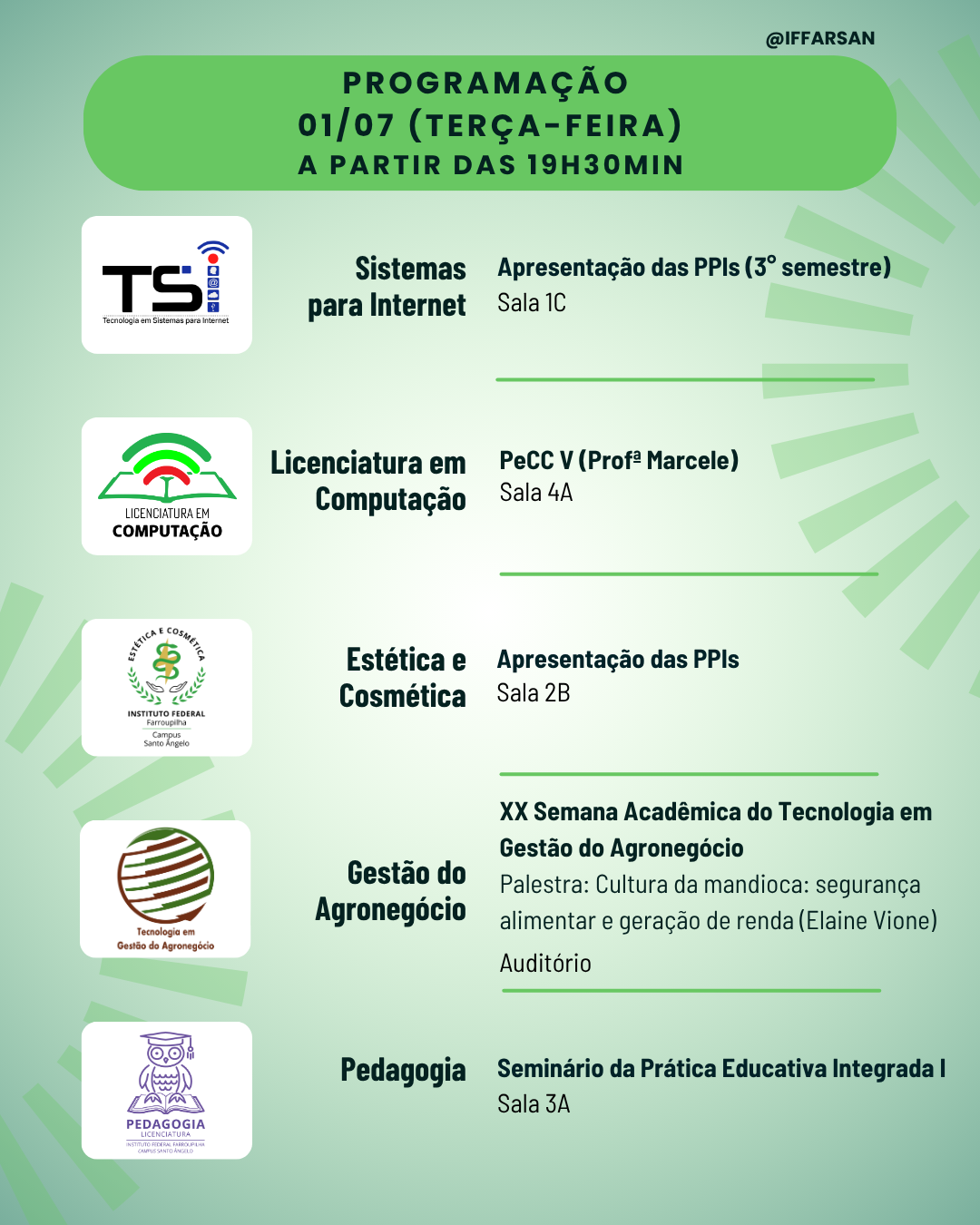 De 30 de junho a 4 de julho, nossos cursos de Sistemas para Internet, Licenciatura em Computação, Pedagogia, Estética e Cosmética, e Gestão do Agronegócio estarão reunidos em uma programação especial, repleta de apresentações de projetos, seminários, palestras e debates.