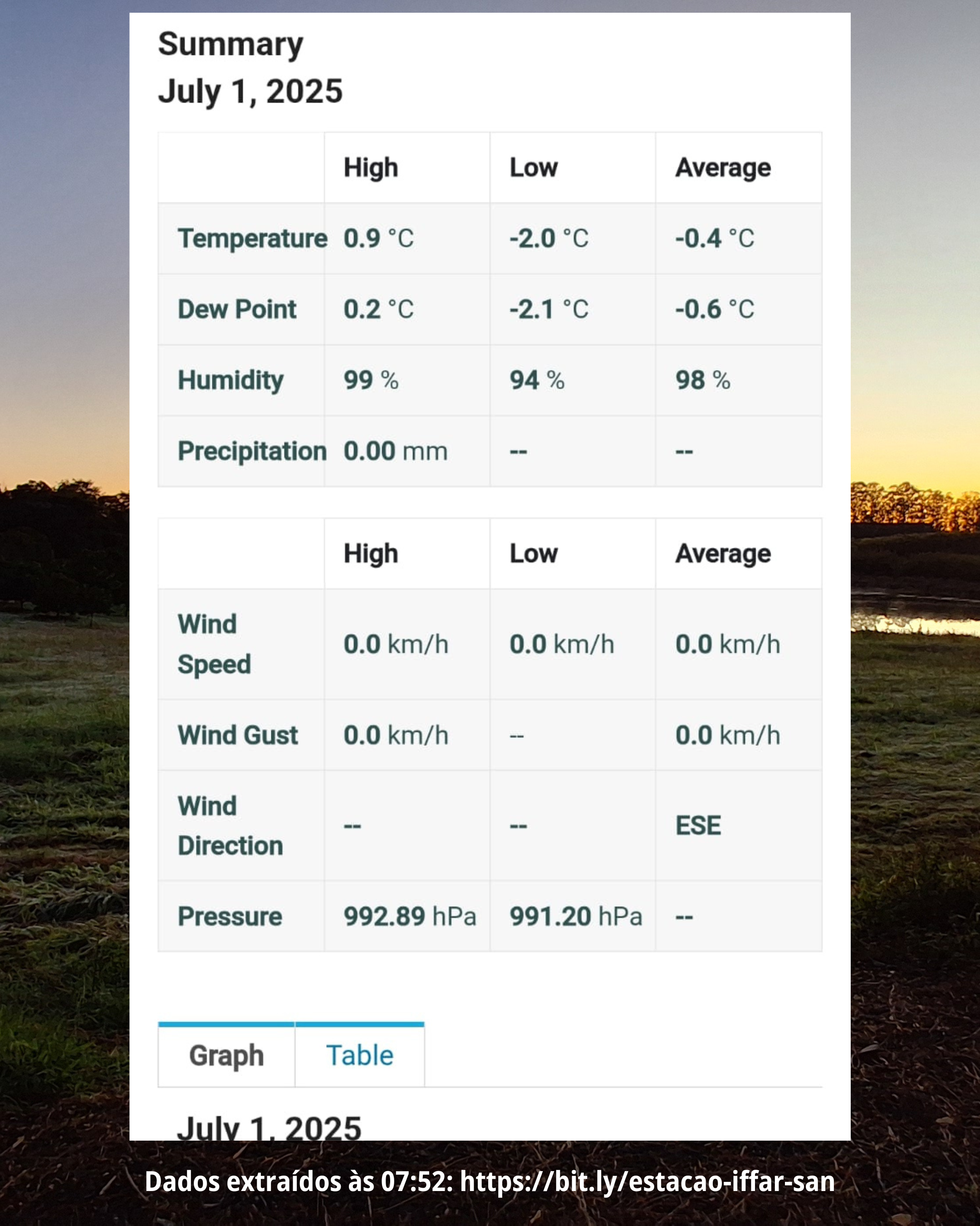 Estação Meteorológica do IFFar - Campus Santo Ângelo registra temperatura negativa de -2ºC no primeiro dia de Julho de 2025