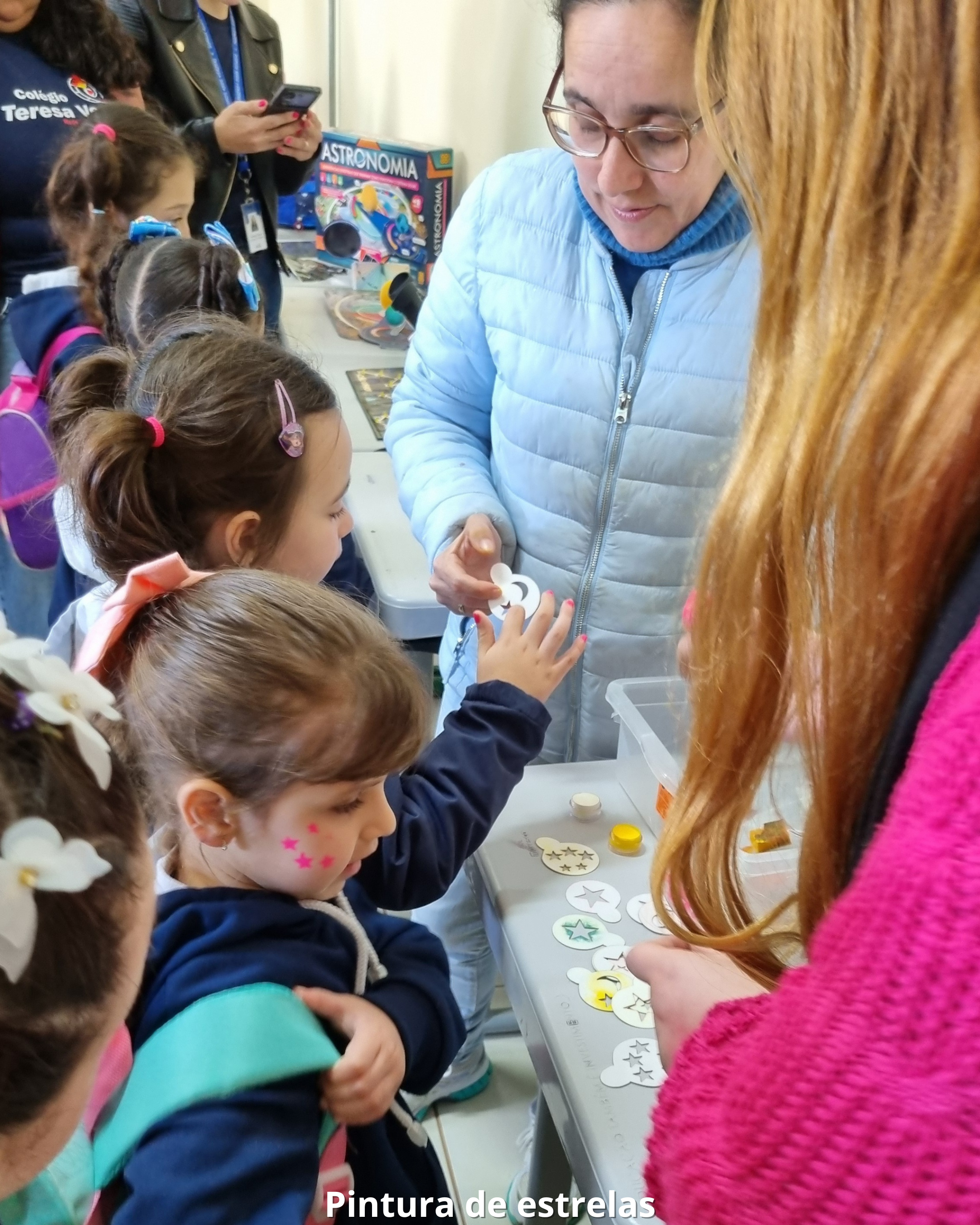 Durante as atividades do Clube de Astronomia, as crianças exploraram materiais de exposição, como jogos, astrofotografias e registros de observações da Lua e de meteoros. Interagiram com o assistente-astronauta-robô Cosmos, conheceram a história da Nicolinha, a mais jovem astrônoma amadora do mundo, observaram no microscópio uma fatia colorida de meteorito e pintaram uma estrelinha no rosto.