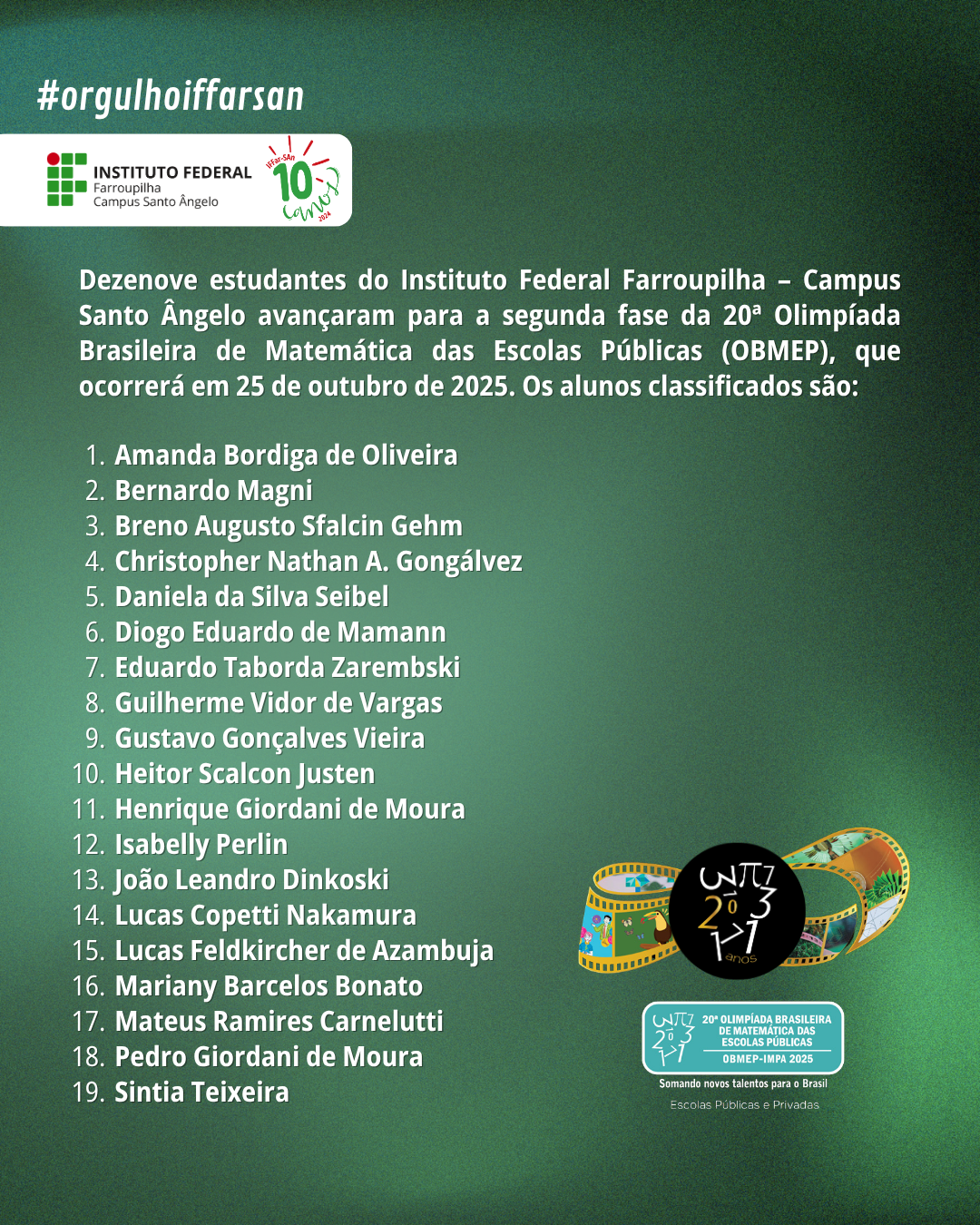 Dezenove estudantes do Instituto Federal Farroupilha – Campus Santo Ângelo foram classificados para a segunda fase da 20ª Olimpíada Brasileira de Matemática das Escolas Públicas (OBMEP). Eles representarão a instituição na prova, que acontecerá em 25 de outubro de 2025, de acordo com o calendário oficial da competição.