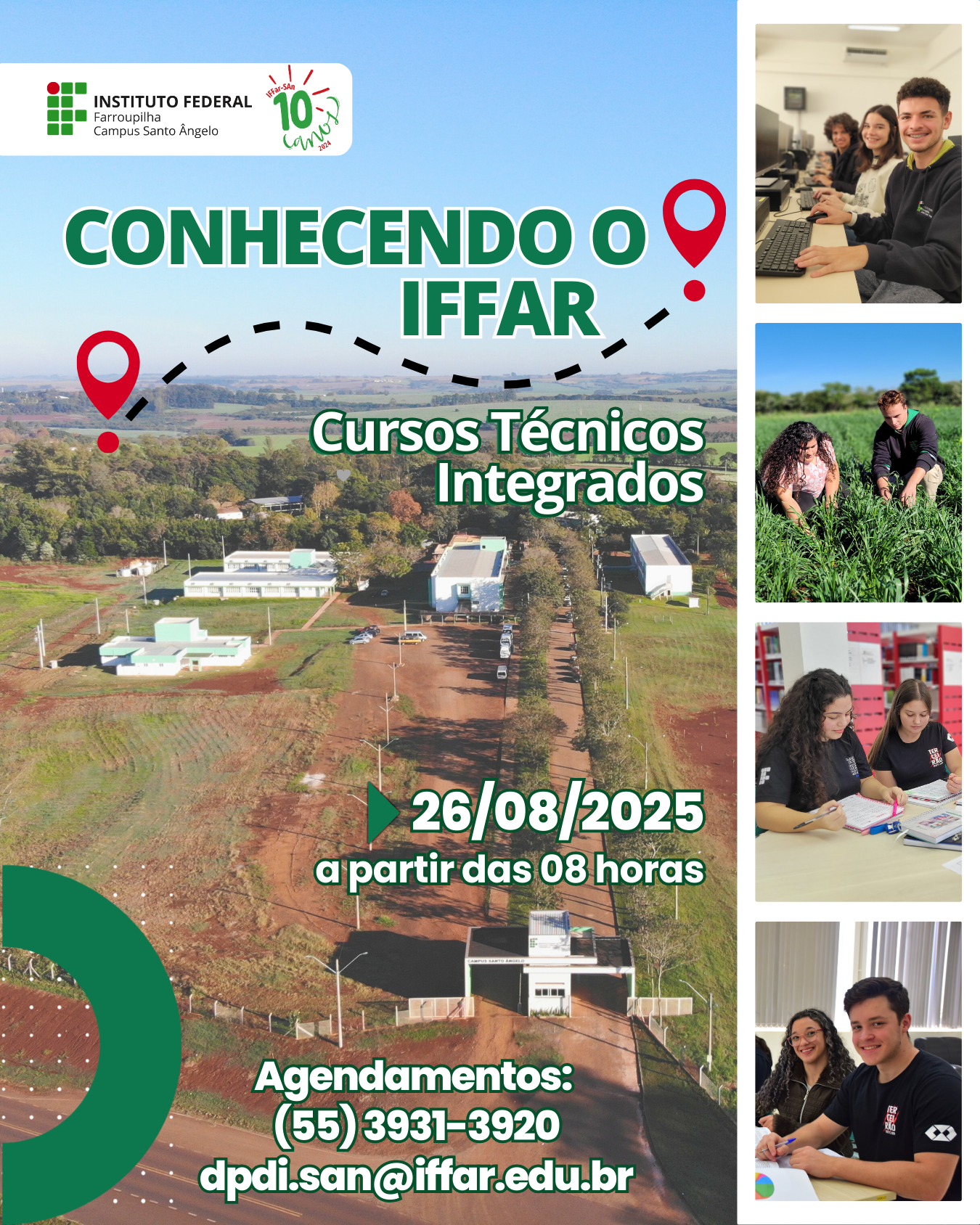 No dia 26/08, a partir das 8h, o IFFar-SAn te espera para uma visita guiada aos laboratórios e setores da instituição, com apresentação dos Cursos Técnicos Integrados ao Ensino Médio, projetos e apoio para inscrição no Processo Seletivo 2026.