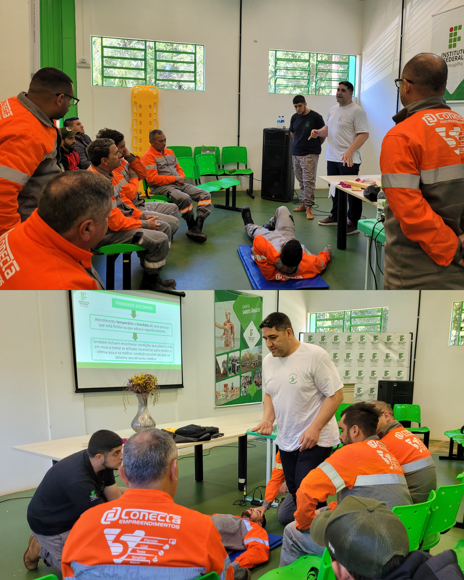 O Instituto Federal Farroupilha – Campus Santo Ângelo sediou uma capacitação em primeiros socorros, realizada a partir da solicitação de uma empresa parceira. A iniciativa foi desenvolvida no âmbito de um projeto de extensão, sob a coordenação das professoras Sandra Cardoso e Rita Fernanda. A atividade contou, ainda, com a participação dos acadêmicos do curso de Bacharelado em Enfermagem, Jairo Fabiano e Lorenzo, cuja contribuição foi fundamental para o êxito do evento.