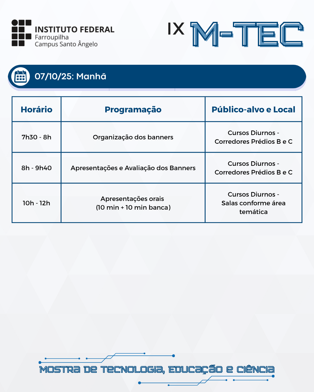 Manhã: Apresentações dos cursos diurnos, mostra de banners nos corredores dos prédios B e C, seguidas pelas apresentações orais nas salas conforme área temática. Cada apresentação terá 10 minutos, seguidos por 10 minutos para as considerações da banca. Terminada uma apresentação, a próxima será iniciada imediatamente.