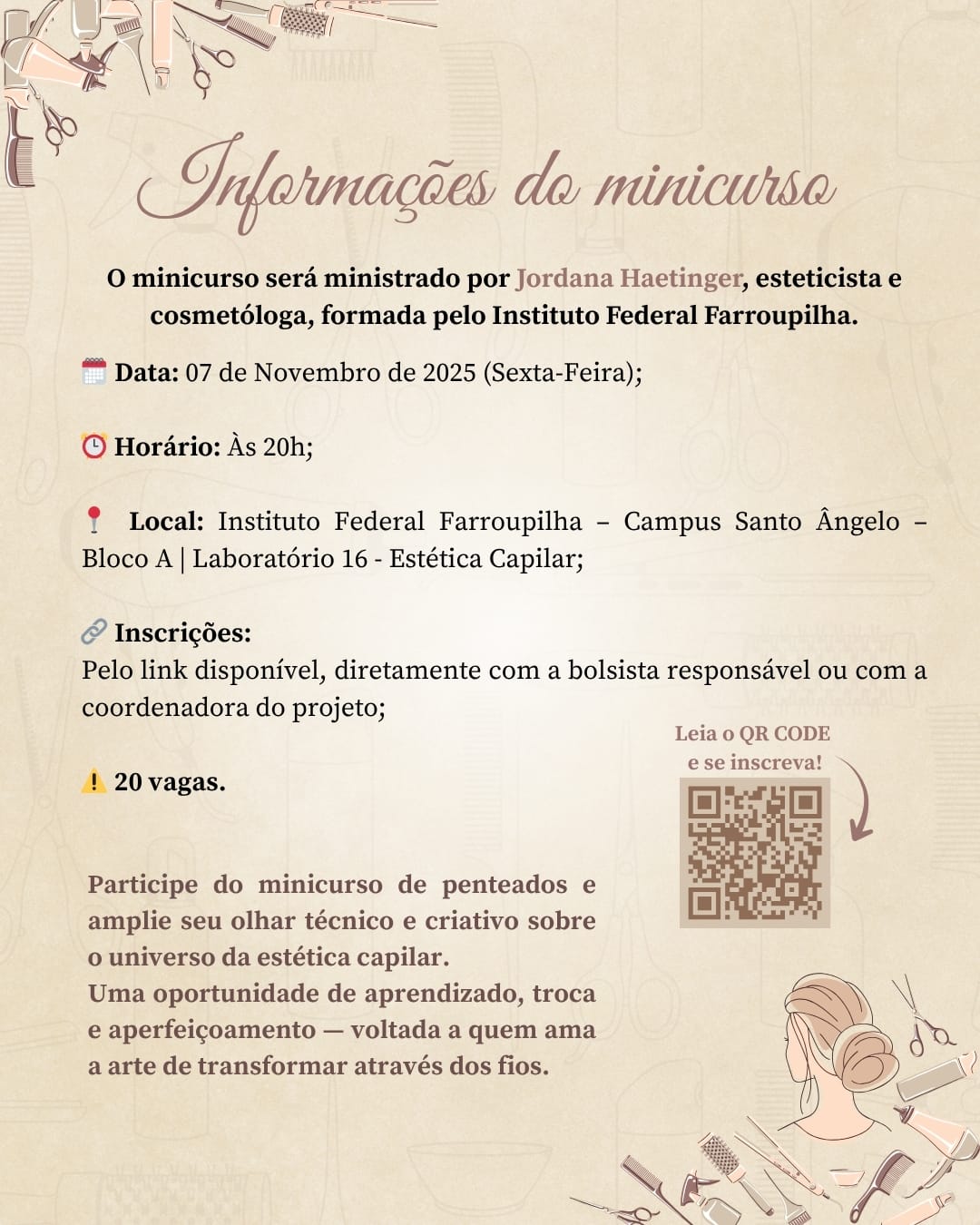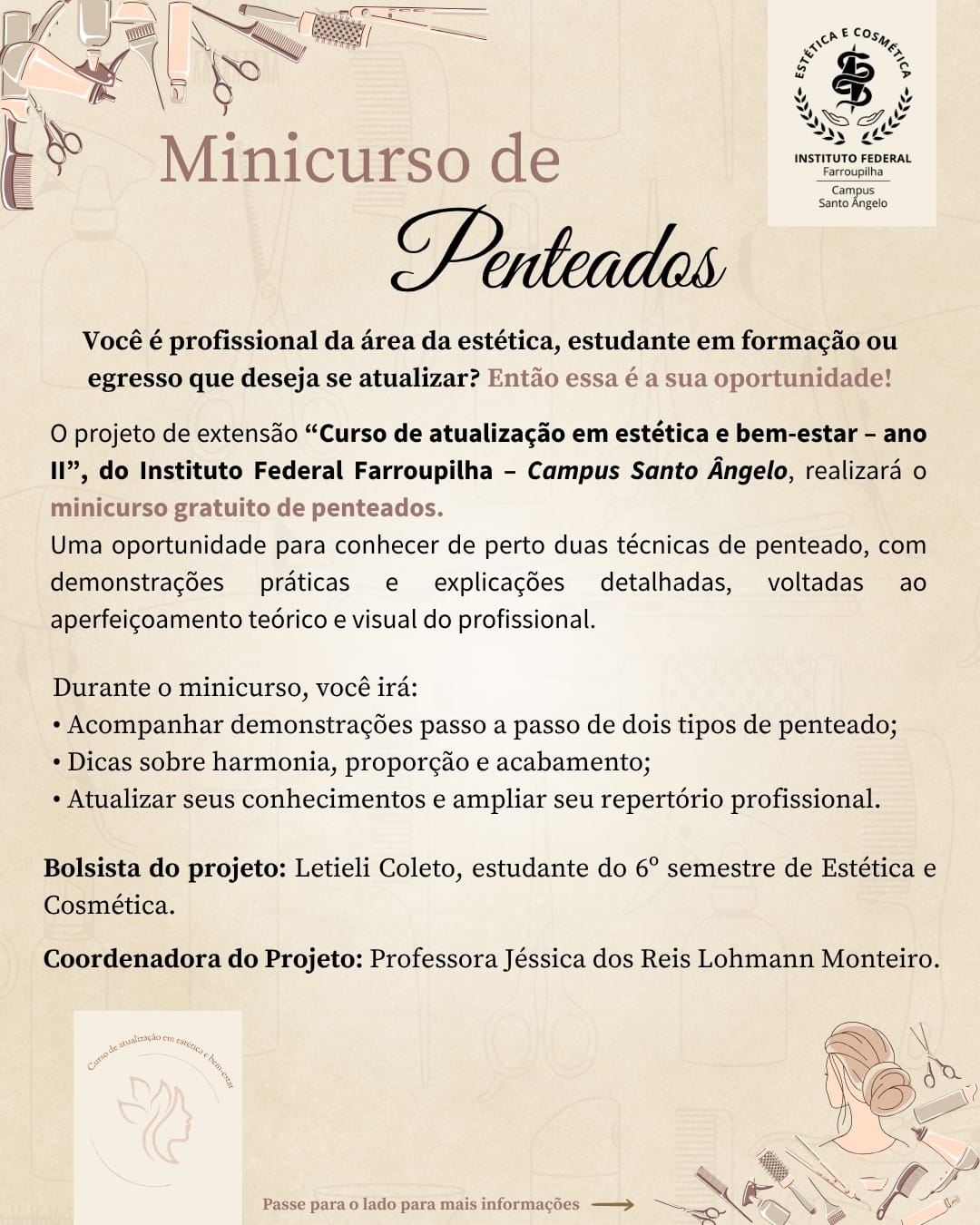 O projeto de extensão “Curso de Atualização em Estética e Bem-Estar – Ano 2” do Instituto Federal Farroupilha – Campus Santo Ângelo convida você para participar do minicurso gratuito de Penteados!