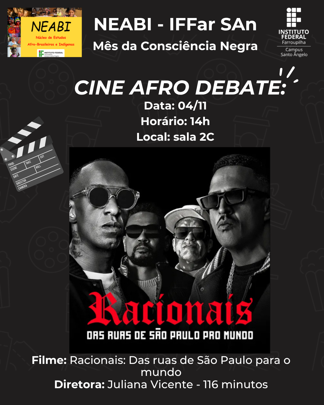 Em celebração ao Mês da Consciência Negra, o NEABI – Núcleo de Estudos Afro-Brasileiros e Indígenas convida toda a comunidade acadêmica para participar do CineAfro Debate, um ciclo de exibições e conversas sobre obras que retratam a cultura, a resistência e as lutas da população negra.