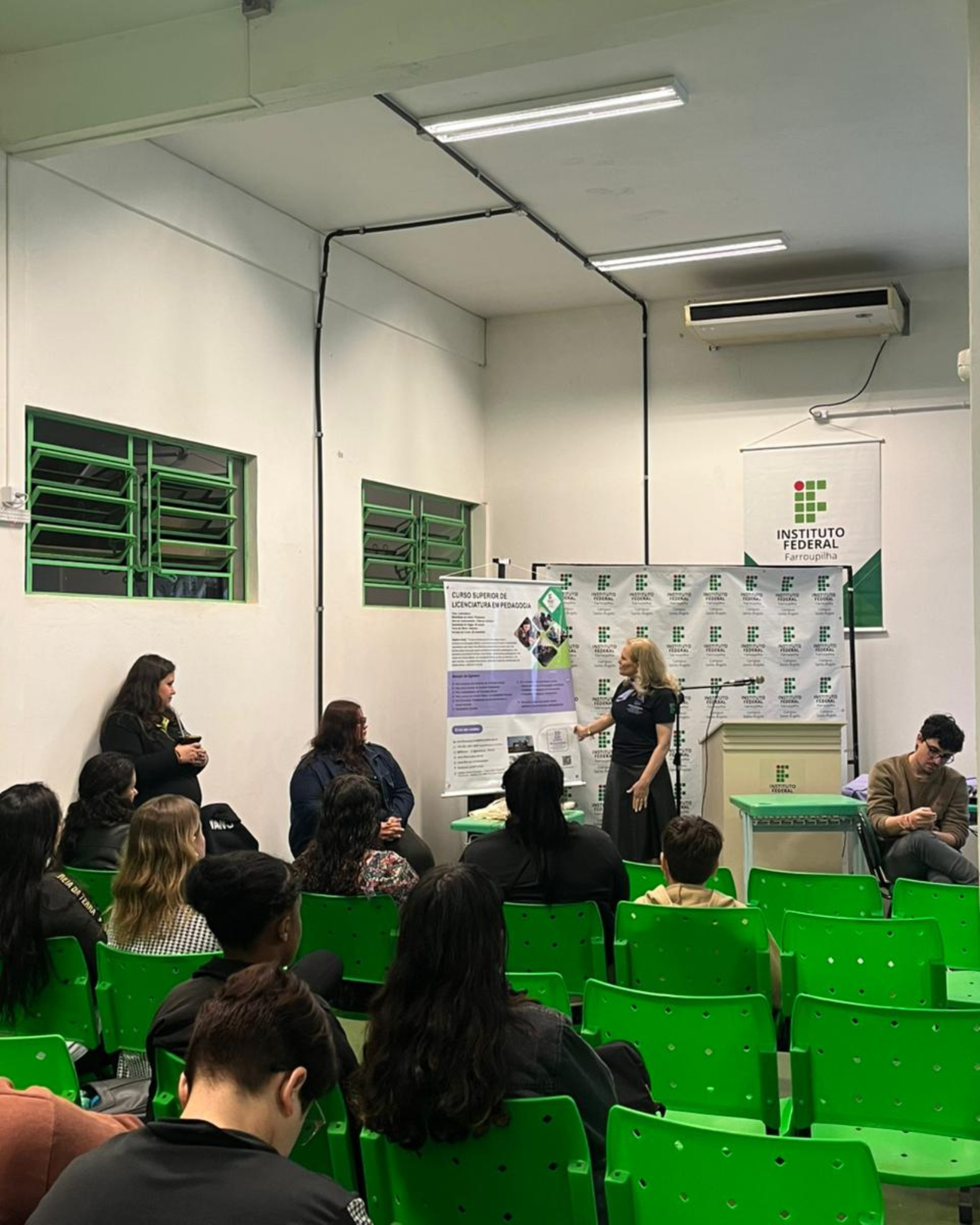 A professora Eliane Felden também apresentou aspectos relevantes do Projeto Pedagógico do Curso Superior de Licenciatura em Pedagogia, ressaltando o amplo campo de atuação dos(as) pedagogos(as) no Brasil, tanto em espaços escolares quanto não escolares. Destacou, ainda, que ser professor(a) no Brasil é um ato legítimo e essencial, uma vez que a Constituição Federal de 1988 garante o direito de acesso à educação para todos os brasileiros dos 4 aos 17 anos.