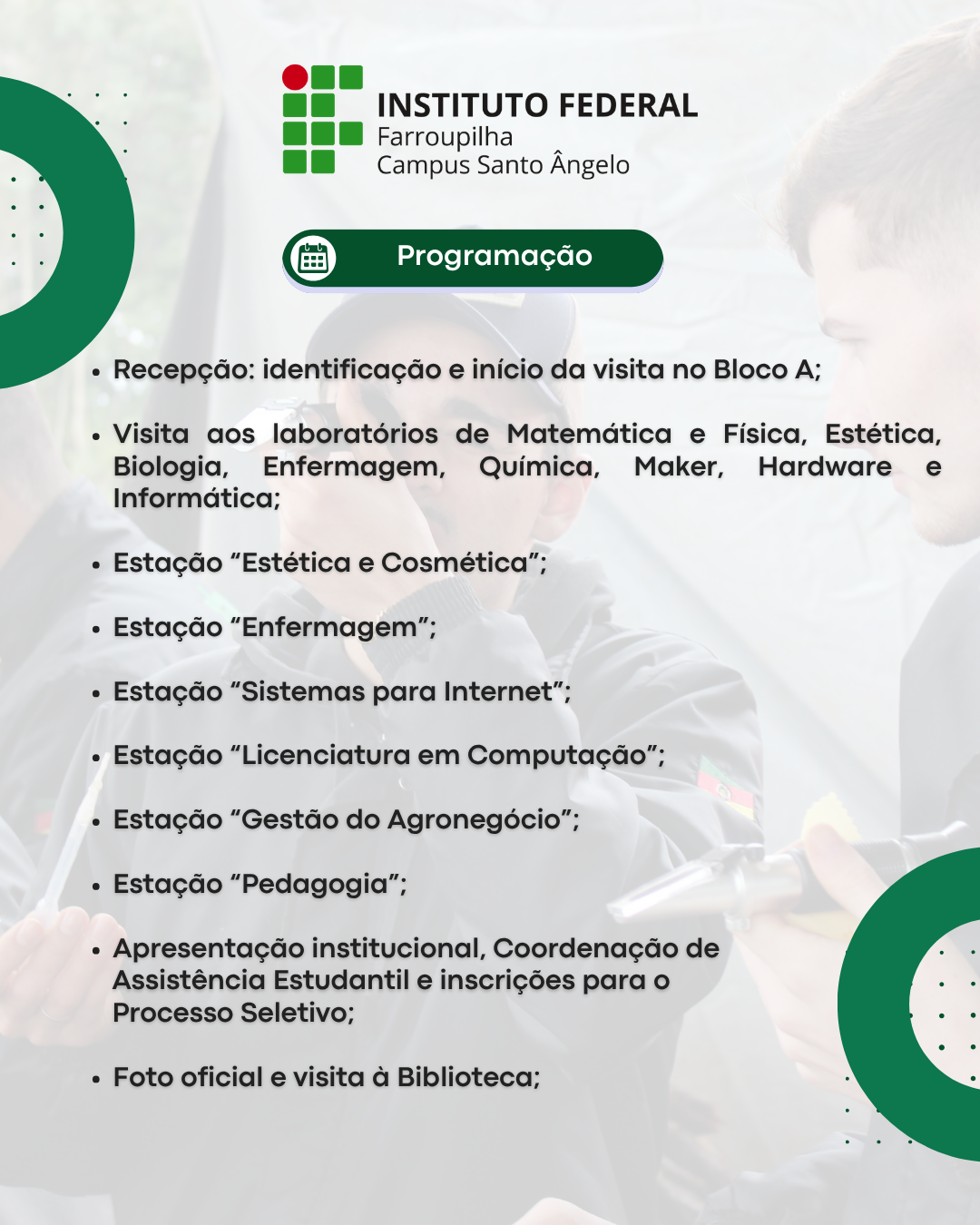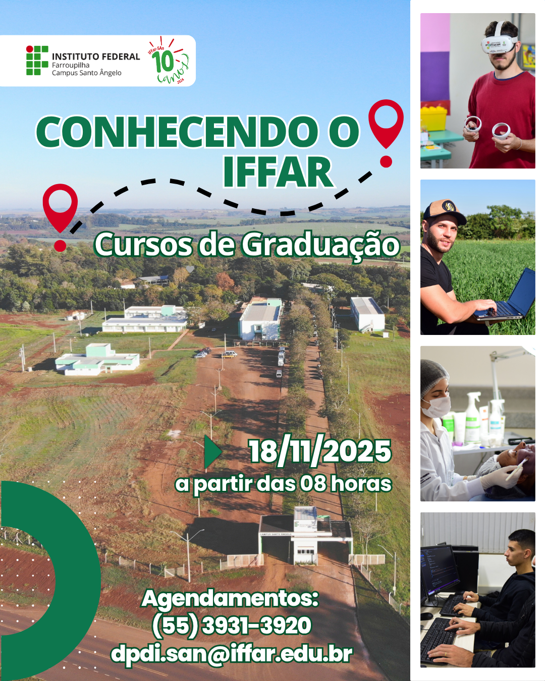 No dia 18/11, a partir das 8h, o IFFar-SAn te espera para uma visita guiada aos laboratórios e setores da instituição, com apresentação dos Cursos de Graduação, projetos desenvolvidos no Campus e apoio para inscrição no Processo Seletivo 2026.