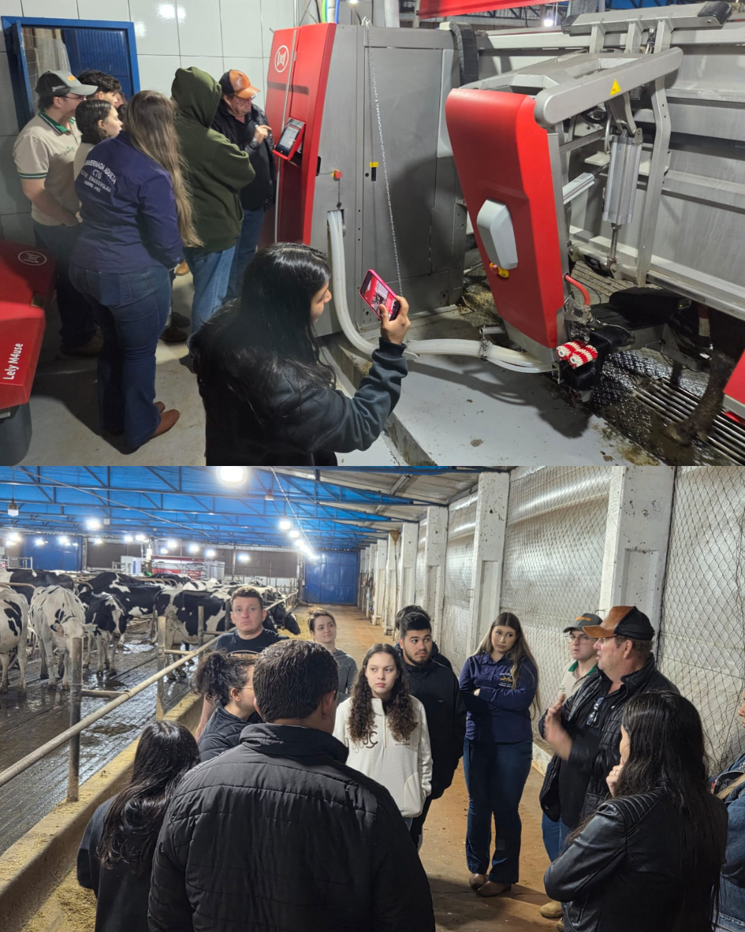 Santo Ângelo/RS, 30 de outubro de 2025 — Estudantes do 4º semestre do Curso de Tecnologia em Gestão do Agronegócio, na disciplina Cadeia Produtiva de Bovinos Leiteiros, realizaram visita técnica à Granja Cassel para conhecer a produção leiteira com ordenha robotizada e o galpão de pressão negativa, que favorece ambiência e bem-estar. A atividade enfatizou gestão por dados, qualidade do leite, biossegurança e impactos econômicos da automação. A ação integra o plano de ensino e fortalece competências para a gestão de sistemas modernos. O IFFar – Campus Santo Ângelo agradece à Granja Cassel pela recepção e parceria.