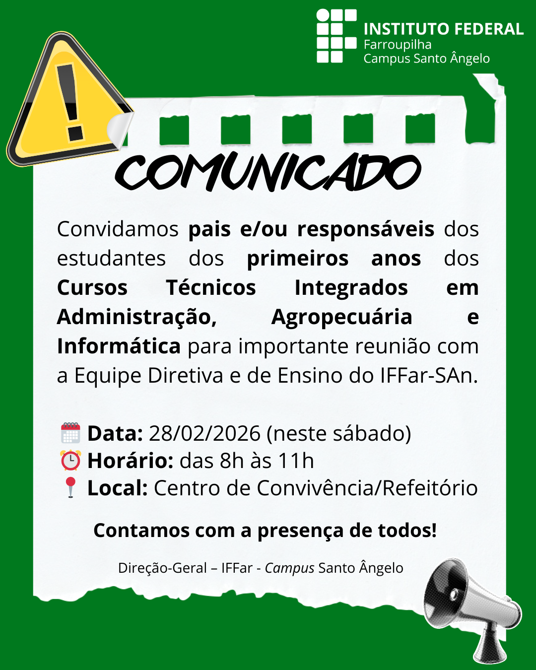 Convidamos pais e/ou responsáveis dos estudantes dos primeiros anos dos Cursos Técnicos Integrados em Administração, Agropecuária e Informática para uma importante reunião com a Equipe Diretiva e de Ensino do IFFar-SAn.