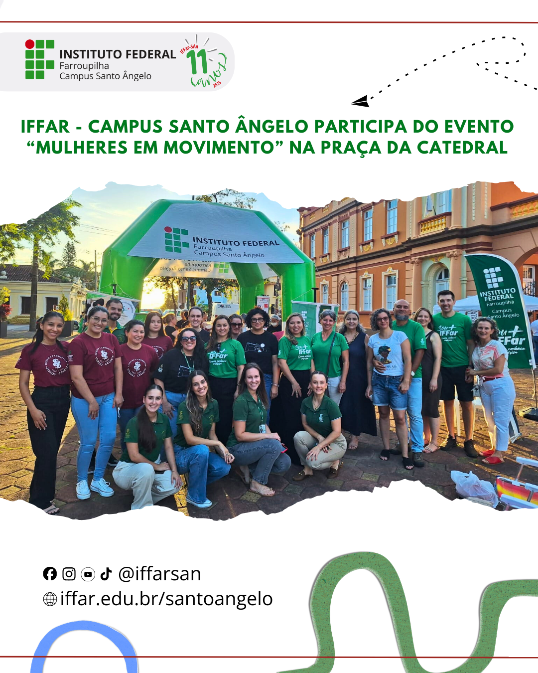 O Instituto Federal Farroupilha – Campus Santo Ângelo participou, no último domingo, 8 de março, do evento “Mulheres em Movimento”, realizado na Praça da Catedral e promovido pelo CRAM – Centro de Referência de Atendimento à Mulher. A iniciativa reuniu diferentes instituições e serviços com o objetivo de promover ações de acolhimento, orientação e valorização das mulheres.