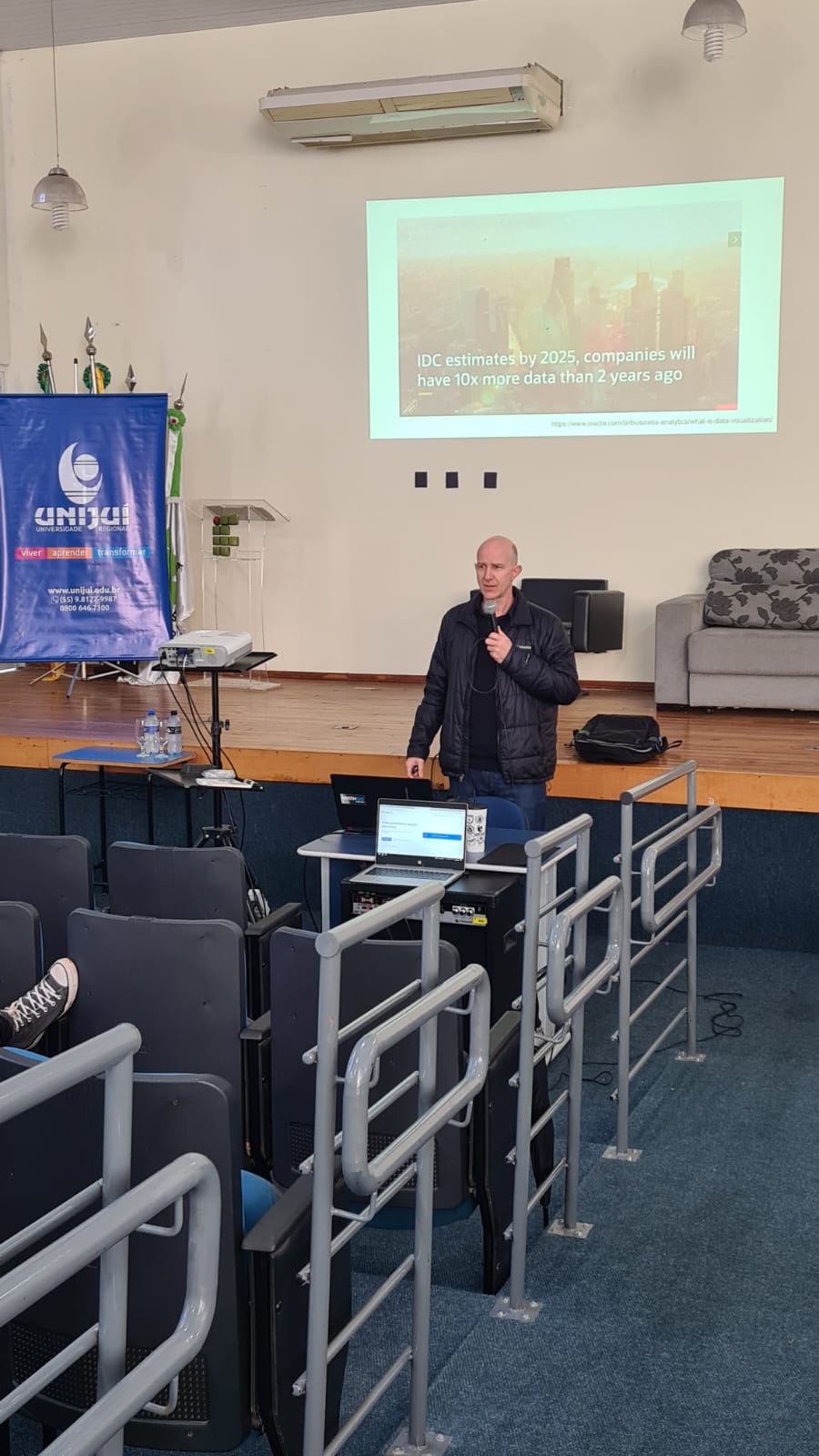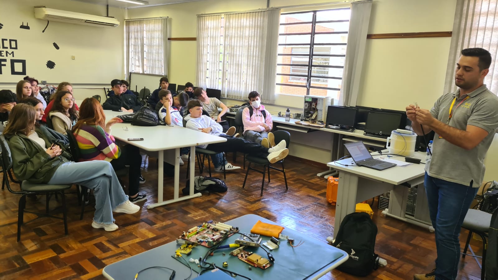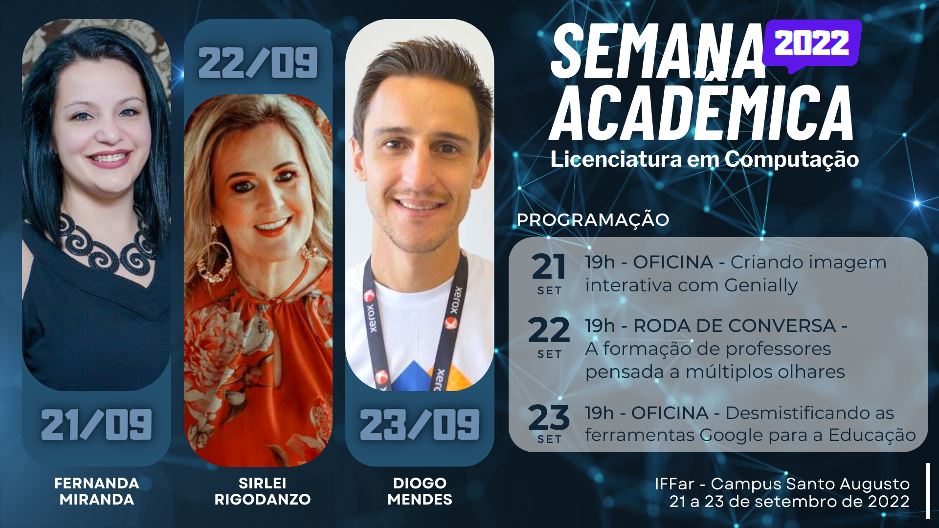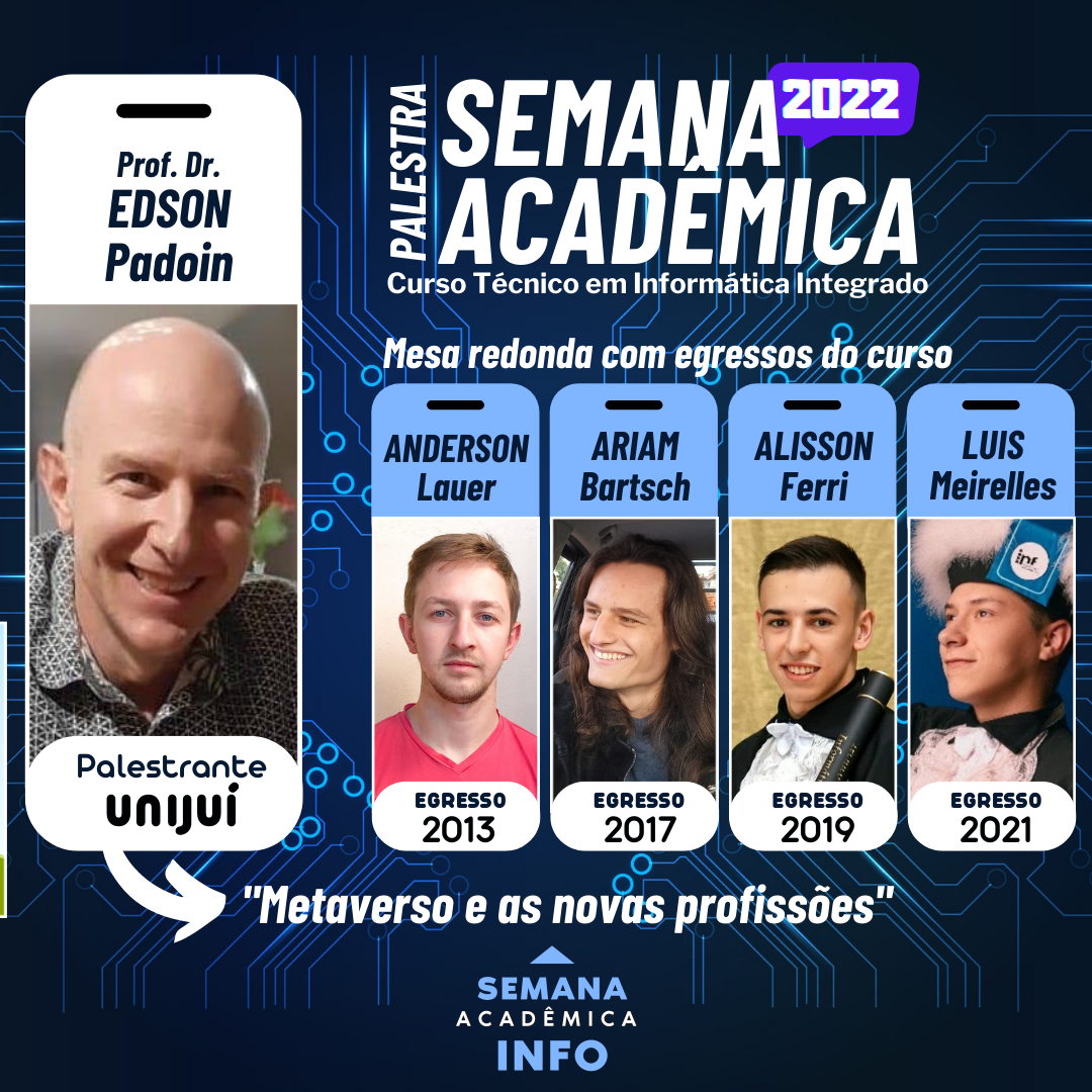 No dia 22, pela manhã, aconteceu palestra com o professor da Unijui, Dr. Edson Luiz Padoin, com o tema “Metaverso e as novas profissões”, seguida pela mesa redonda com os egressos do curso, Anderson Lauer, Ariam Bartsch, Alisson Ferri e Luís Meirelles. À tarde foram realizadas as seguintes oficinas: Renira Carla Soares - Introdução à robótica com Arduino, Juliani Natália dos Santos - Comunicação inclusiva: Aprenda Libras você também, Franciele da Silva dos Anjos Strohhecker - Identidade, interesse e existência, Gustavo Palese - Infraestrutura de redes de fibra, Uianes Luiz Rockenbach Biondo - Criando seus primeiros Apps com ReactNative e Rafael Ramos - Programação de Apps com App Inventor. À noite roda de conversa com a professora do Campus Panambi, Sirlei Rigodanzo, com o tema “A formação de professores pensada nos múltiplos olhares”.