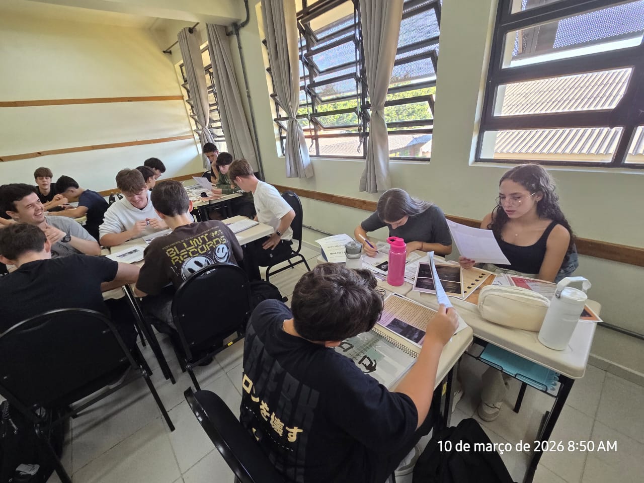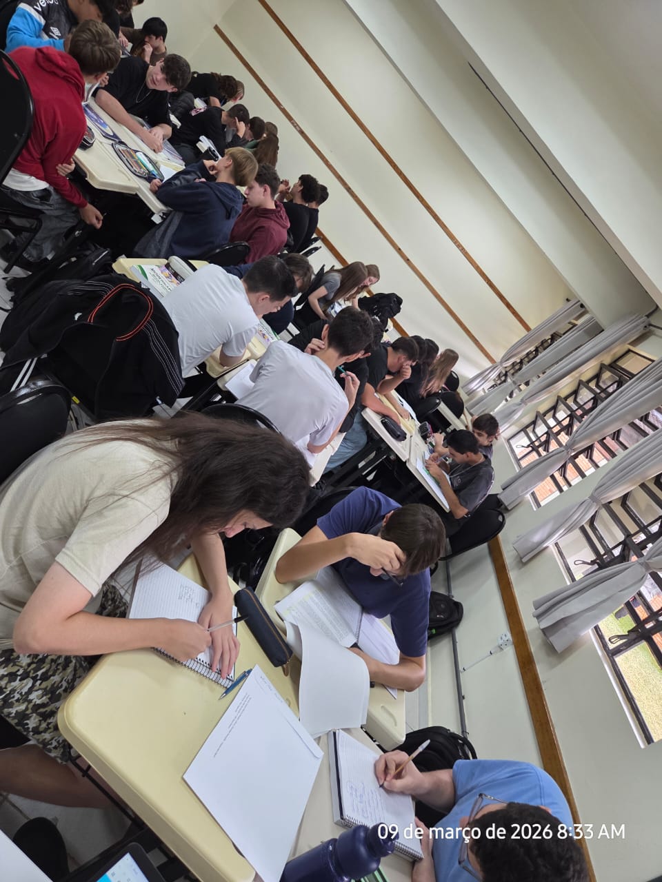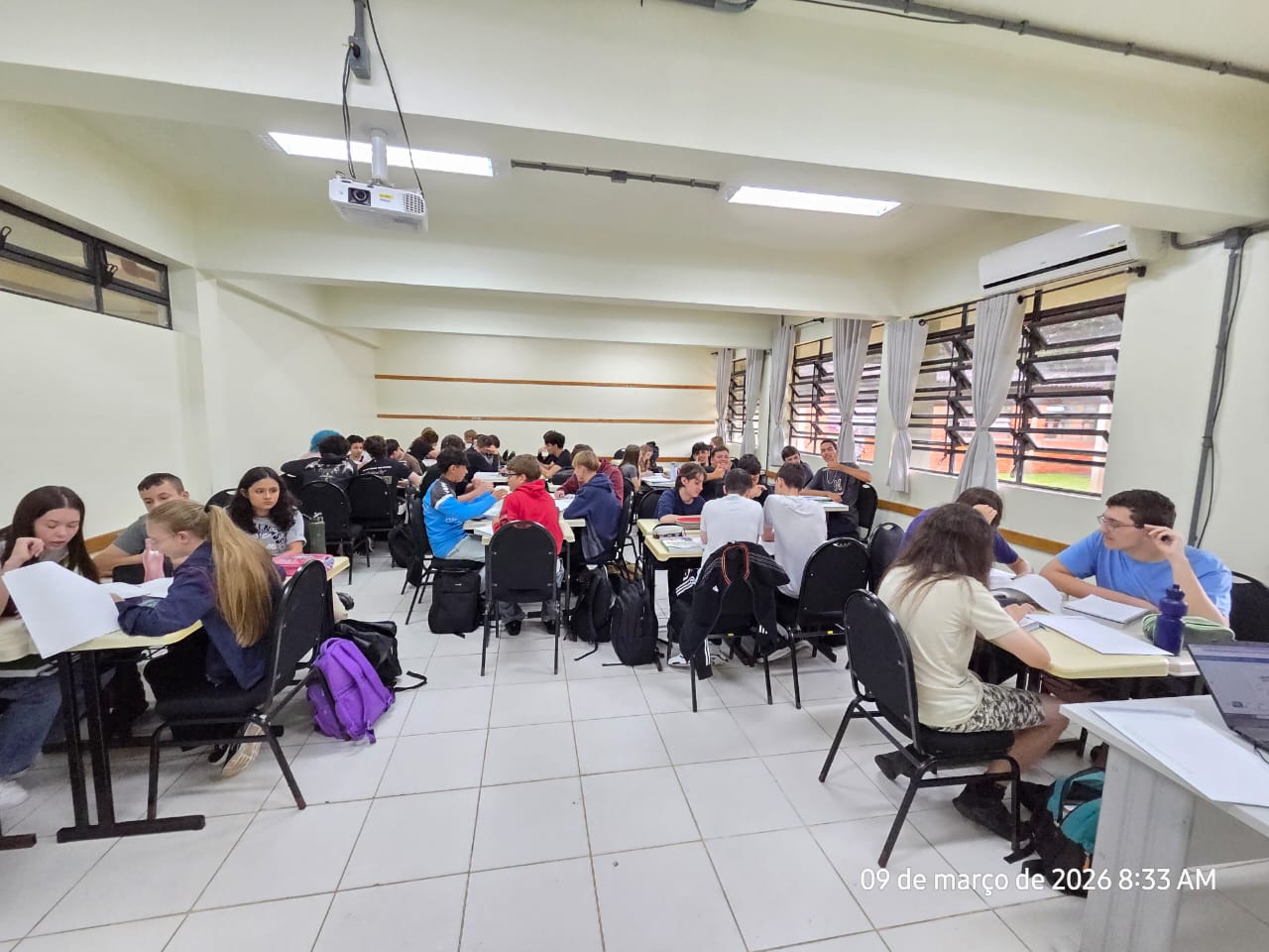 Os alunos do primeiro ano dos cursos técnicos em Administração e Informática realizaram uma atividade prática sobre Perícia Criminal na disciplina de Biologia, ministrada pela professora Camila Copetti, que transformou a sala de aula em um laboratório de investigação.
