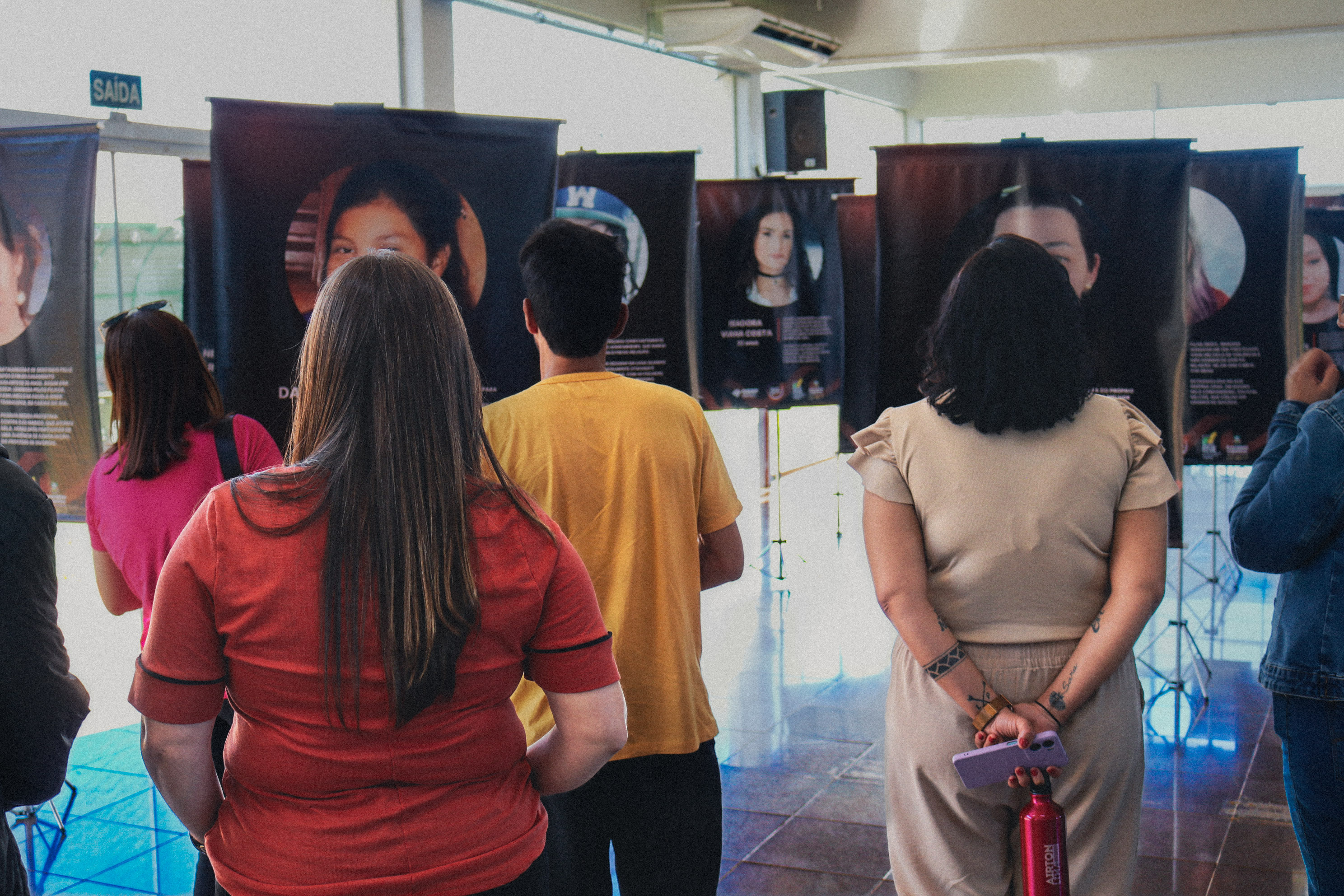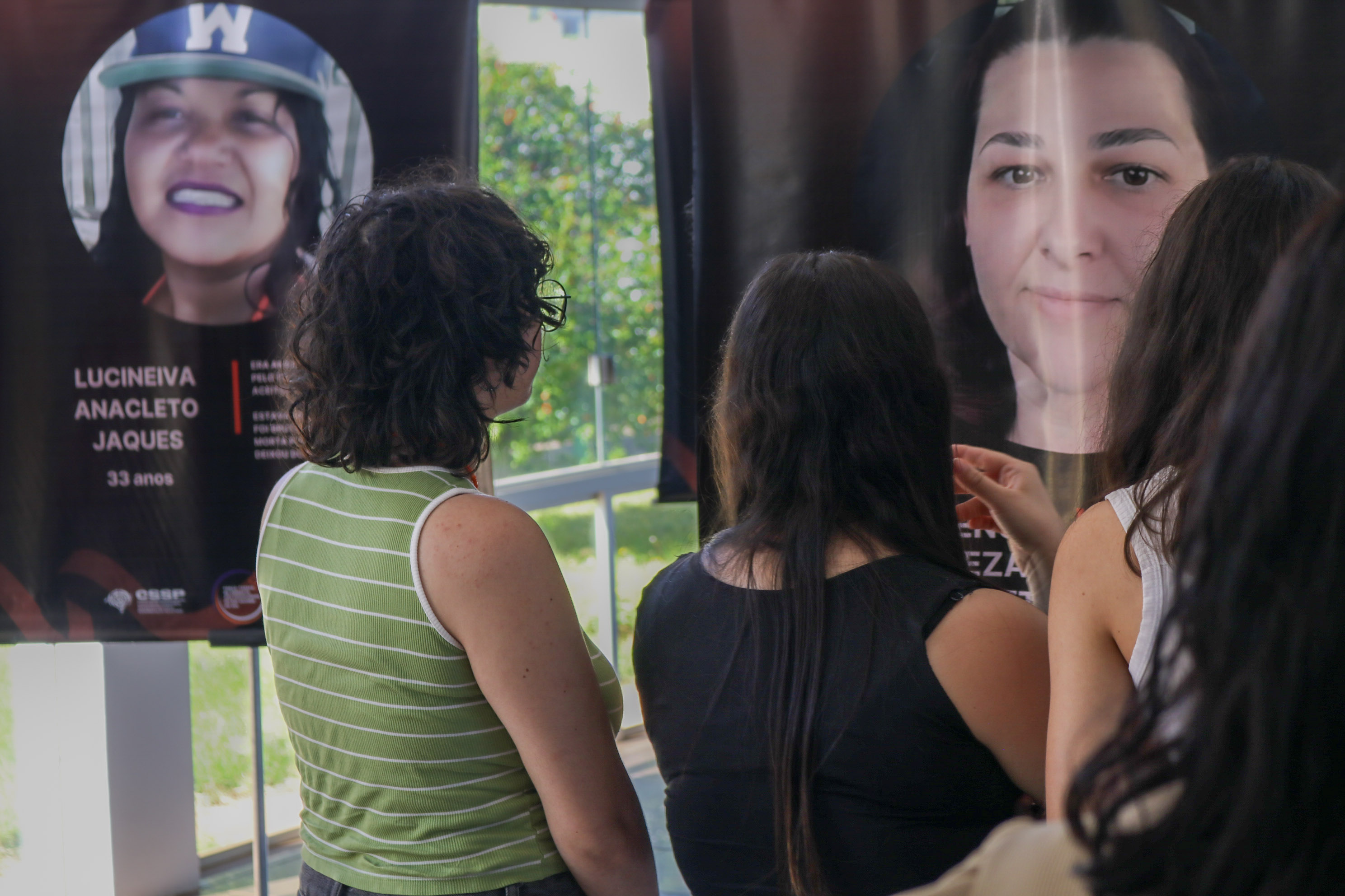 Os banners expostos apresentavam fotografias e histórias de mulheres vítimas de feminicídio no Rio Grande do Sul, reforçando o caráter impactante e reflexivo da mostra.