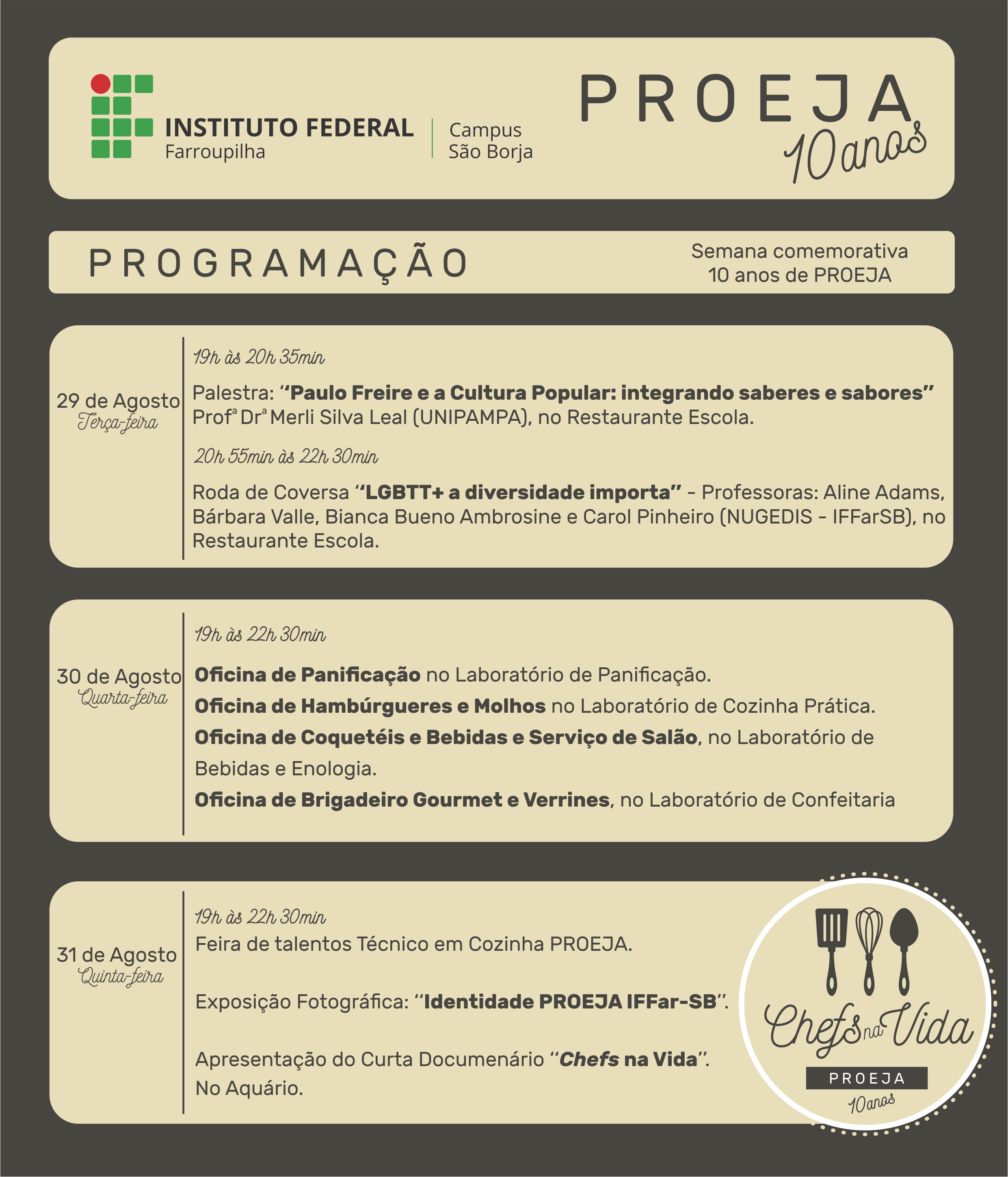 A Semana de Comemoração dos 10 Anos do PROEJA oportuniza o (re)encontro de alunos egressos, alunos matriculados e servidores. Este evento acontecerá nos dias 29, 30 e 31 de agosto nas dependências do IF Farroupilha - Campus São Borja. As atividades dos dias 29 e 31 de agosto também são abertas aos alunos egressos.