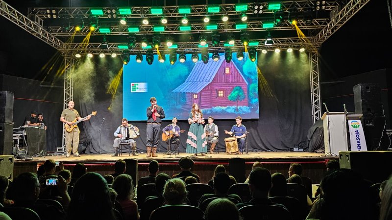 O IFFar – Campus Santa Rosa, que em 2025 completa 15 anos de existência e carrega em seu nome a referência à história do Rio Grande do Sul, esteve representado, no dia 4 de novembro, no evento “Musicanto vai à Escola”. Esse evento tem como objetivo valorizar a cultura, integrar os estudantes e difundir os 42 anos de trajetória do Musicanto. No Centro Cívico Cultural Antônio Carlos Borges, em Santa Rosa, subiram ao palco os estudantes Mateus da Rosa, Matheus Stein, Ana Laura Engel, Guilherme Silva, Bruno Weber e Emanuel Klatt, acompanhados do servidor Giancarlo Calliari, para interpretar a música “Milongueando a Solidão”, composta por Gujo Teixeira e Érlon Péricles. Simultaneamente, foi projetada uma pintura inspirada na mesma canção, realizada por Amanda Engster Volken.