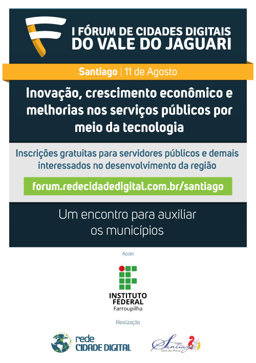 O Instituto Federal Farroupilha destaca-se como um dos apoiadores do I Fórum de Cidades Digitais do Vale do Jaguari. Trata-se de um evento gratuito, cujo público-alvo é formado por prefeitos, gestores e vereadores, e a pauta principal trata do uso da tecnologia na solução de diversos problemas urbanos, estimulando investimentos para o aprimoramento dos serviços públicos e no desenvolvimento das cidades.