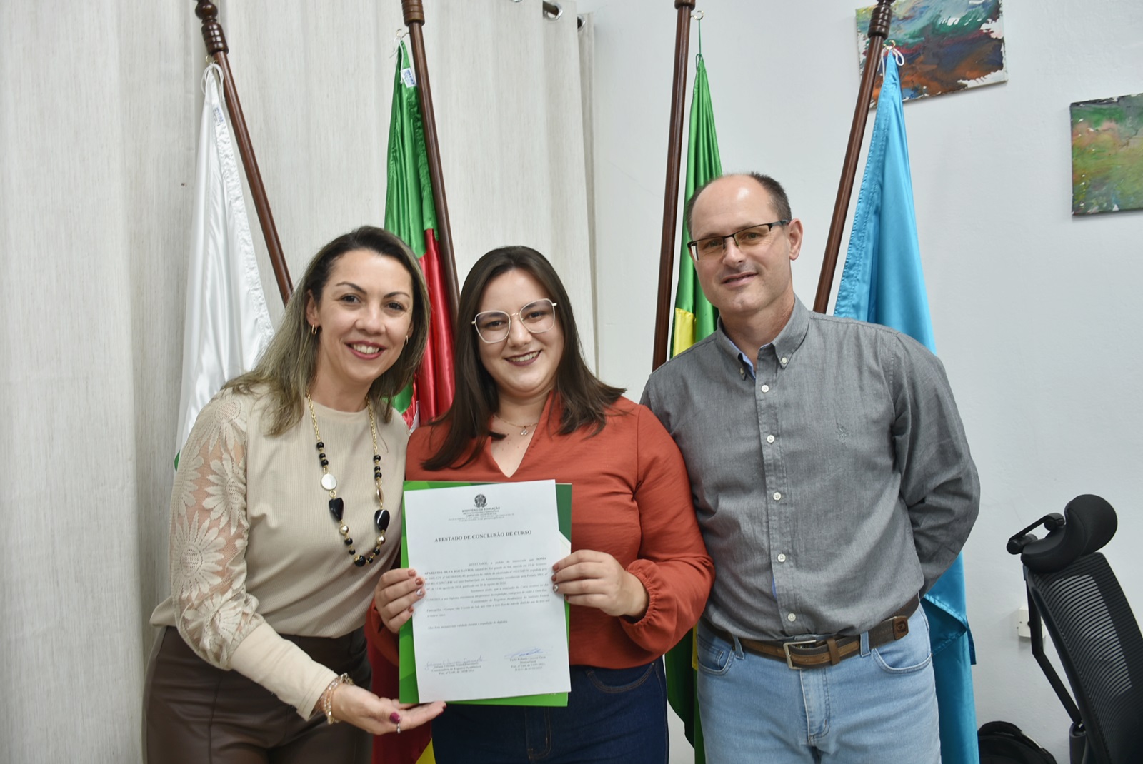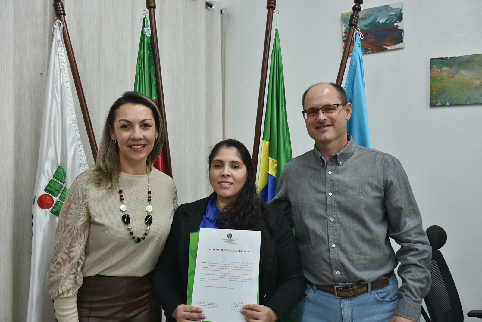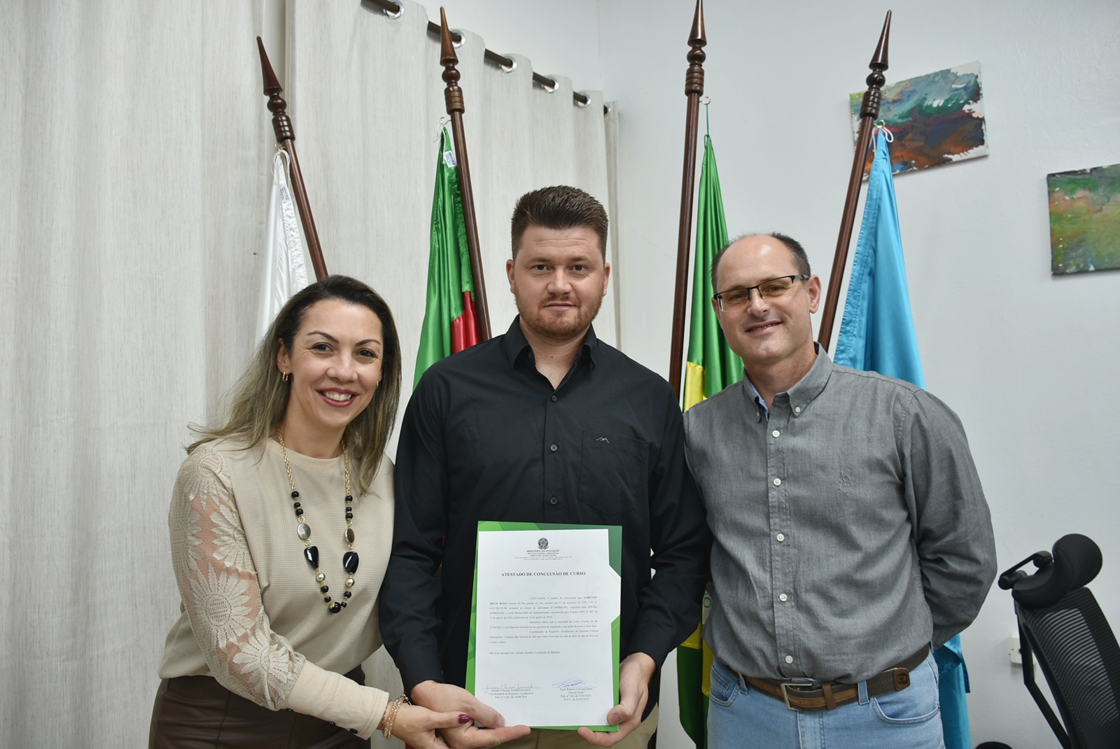 O ato solene ocorreu na sala da Direção-Geral e contou com a presença do diretor-geral do campus, professor Paulo Roberto Cecconi Deon; da coordenadora do curso, professora Vanessa Almeida da Silva; e da chefe de gabinete substituta, servidora Silviana Delavechia Gibicoski. Amigos e familiares dos formandos também prestigiaram a cerimônia.
