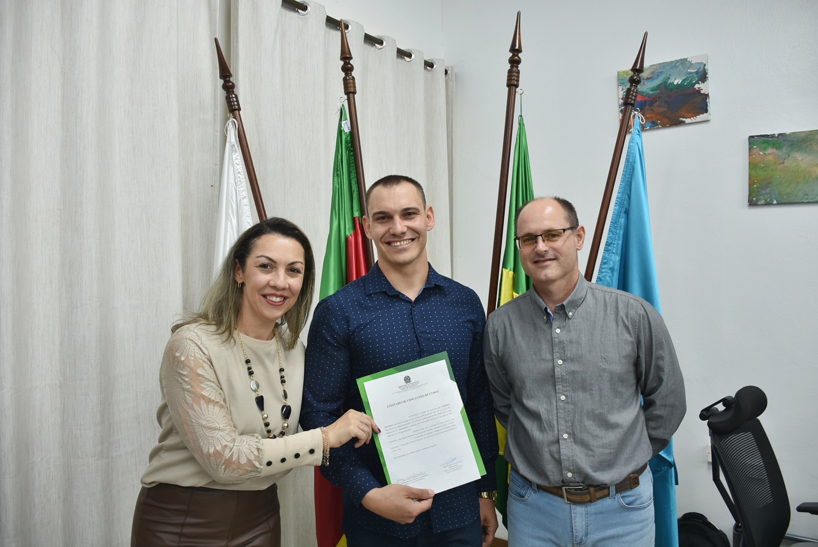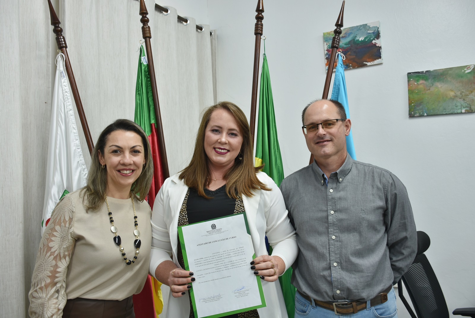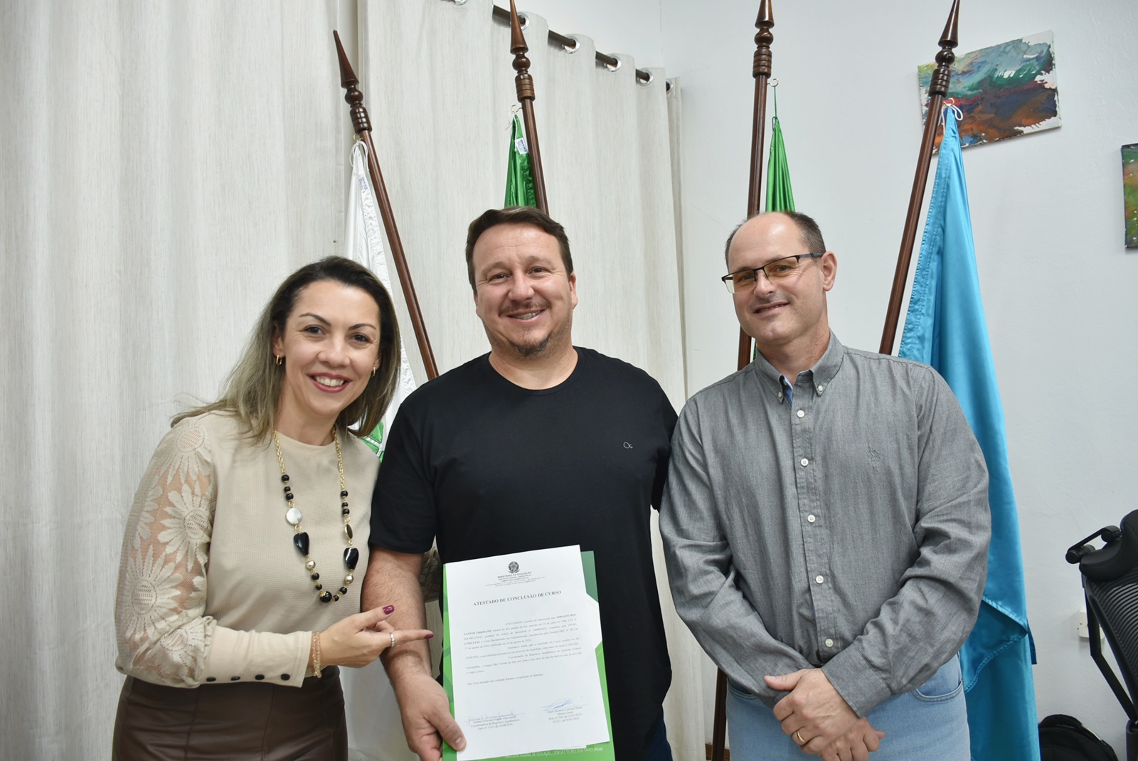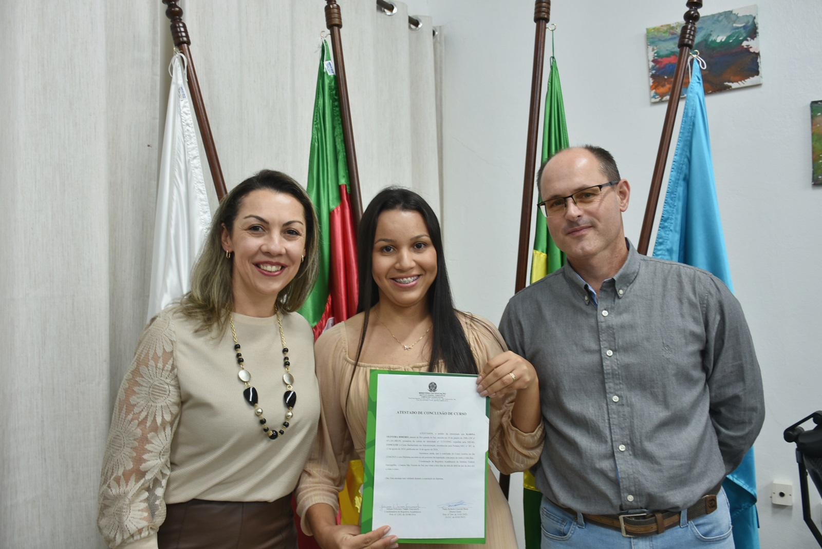 O ato solene ocorreu na sala da Direção-Geral e contou com a presença do diretor-geral do campus, professor Paulo Roberto Cecconi Deon; da coordenadora do curso, professora Vanessa Almeida da Silva; e da chefe de gabinete substituta, servidora Silviana Delavechia Gibicoski. Amigos e familiares dos formandos também prestigiaram a cerimônia.