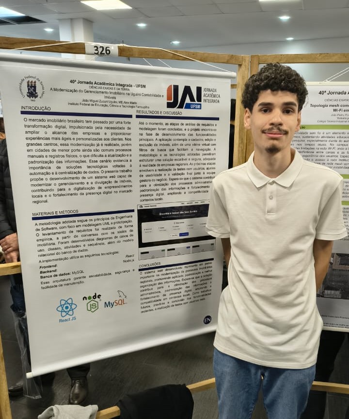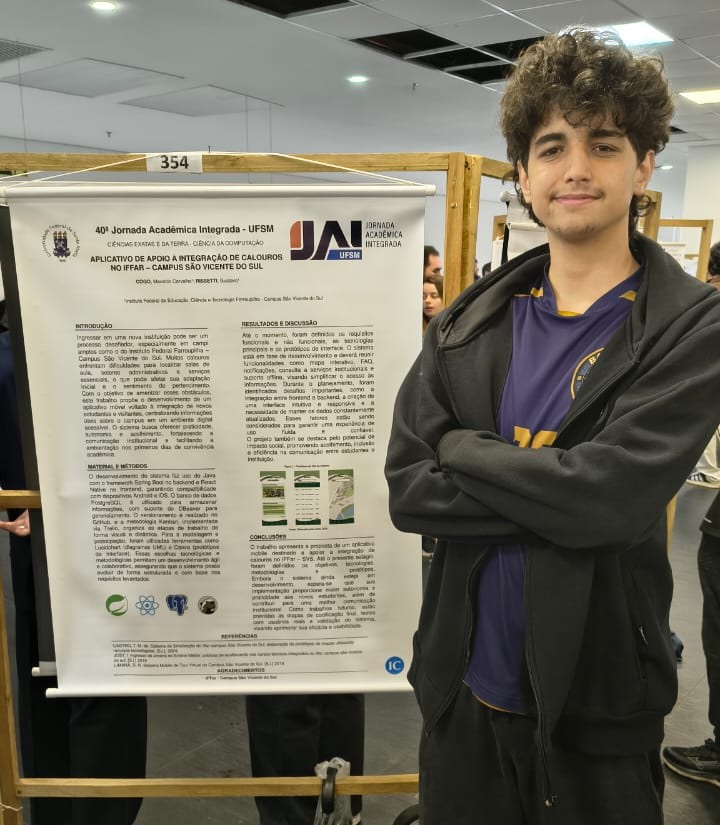 De 3 a 7 de novembro, acadêmicos de diversos cursos do Campus São Vicente do Sul participaram da Jornada Acadêmica Integrada (JAI) da Universidade Federal de Santa Maria (UFSM), evento científico que reúne apresentações de trabalhos de pesquisa, ensino, extensão e inovação desenvolvidos por estudantes de instituições da região.