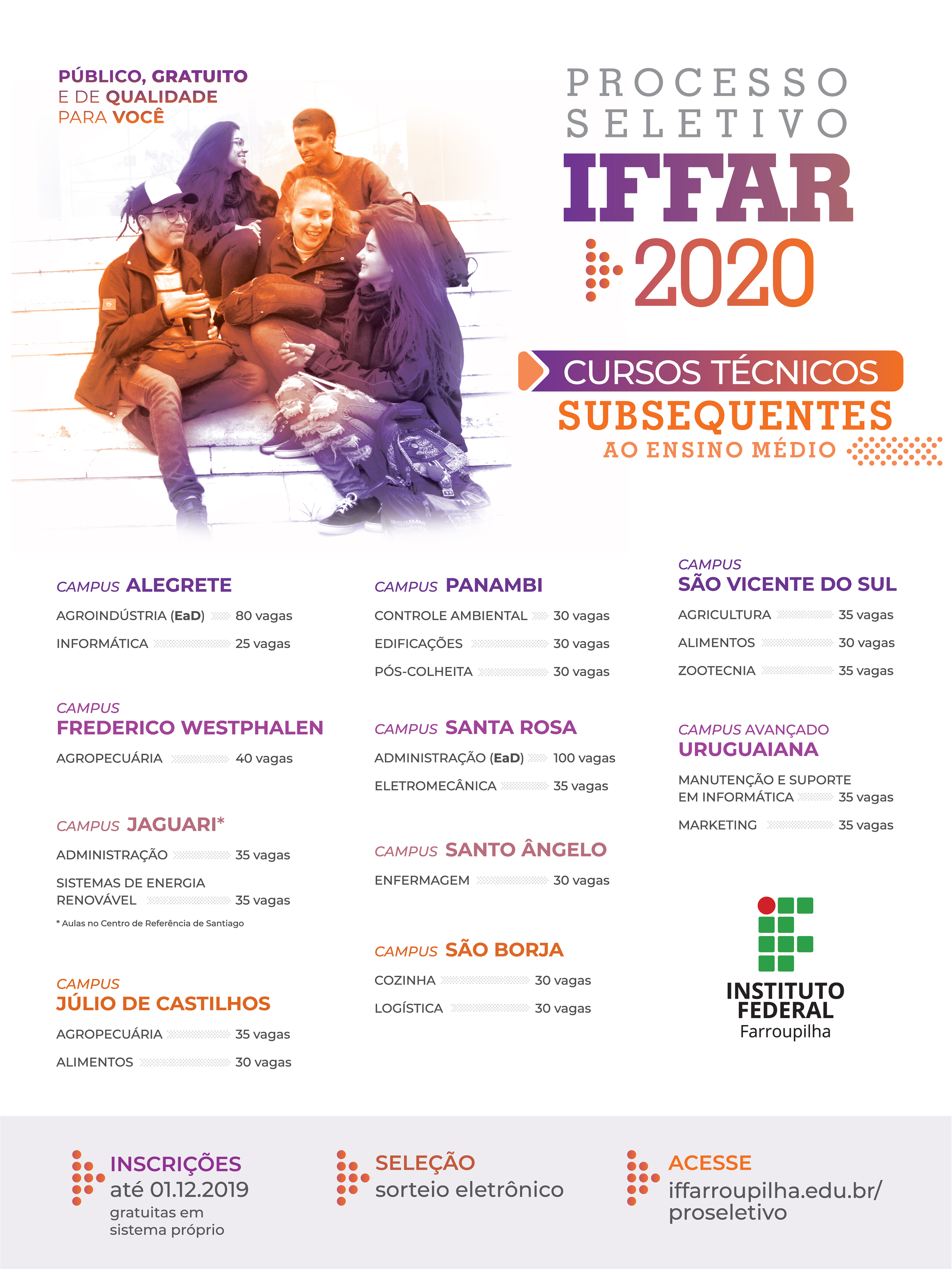 Os cursos técnicos subsequentes são para quem já concluiu ou conclui neste ano o Ensino Médio. Confira os cursos e vagas ofertados na seleção para ingresso em 2020: